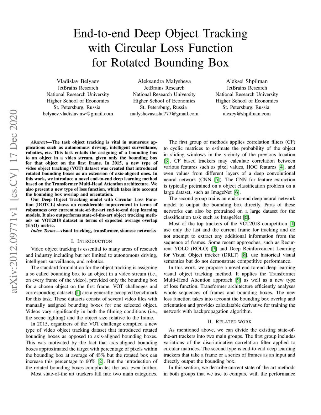 The task object tracking is vital in numerous applications such as autonomous driving, intelligent surveillance, robotics, etc. This task entails the assigning of a bounding box to an object in a video stream, given only the bounding box for that object on the first frame. In 2015, a new type of video object tracking (VOT) dataset was created that introduced rotated bounding boxes as an extension of axis-aligned ones. In this work, we introduce a novel end-to-end deep learning method based on the Transformer Multi-Head Attention architecture. We also present a new type of loss function, which takes into account the bounding box overlap and orientation. Our Deep Object Tracking model with Circular Loss Function (DOTCL) shows an considerable improvement in terms of robustness over current state-of-the-art end-to-end deep learning models. It also outperforms state-of-the-art object tracking methods on VOT2018 dataset in terms of expected average overlap (EAO) metric.