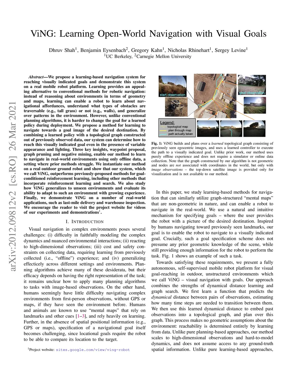 We propose a learning-based navigation system for reaching visually indicated goals and demonstrate this system on a real mobile robot platform. Learning provides an appealing alternative to conventional methods for robotic navigation: instead of reasoning about environments in terms of geometry and maps, learning can enable a robot to learn about navigational affordances, understand what types of obstacles are traversable (e.g., tall grass) or not (e.g., walls), and generalize over patterns in the environment. However, unlike conventional planning algorithms, it is harder to change the goal for a learned policy during deployment. We propose a method for learning to navigate towards a goal image of the desired destination. By combining a learned policy with a topological graph constructed out of previously observed data, our system can determine how to reach this visually indicated goal even in the presence of variable appearance and lighting. Three key insights, waypoint proposal, graph pruning and negative mining, enable our method to learn to navigate in real-world environments using only offline data, a setting where prior methods struggle. We instantiate our method on a real outdoor ground robot and show that our system, which we call ViNG, outperforms previously-proposed methods for goal-conditioned reinforcement learning, including other methods that incorporate reinforcement learning and search. We also study how \sysName generalizes to unseen environments and evaluate its ability to adapt to such an environment with growing experience. Finally, we demonstrate ViNG on a number of real-world applications, such as last-mile delivery and warehouse inspection. We encourage the reader to visit the project website for videos of our experiments and demonstrations sites.google.com/view/ving-robot.