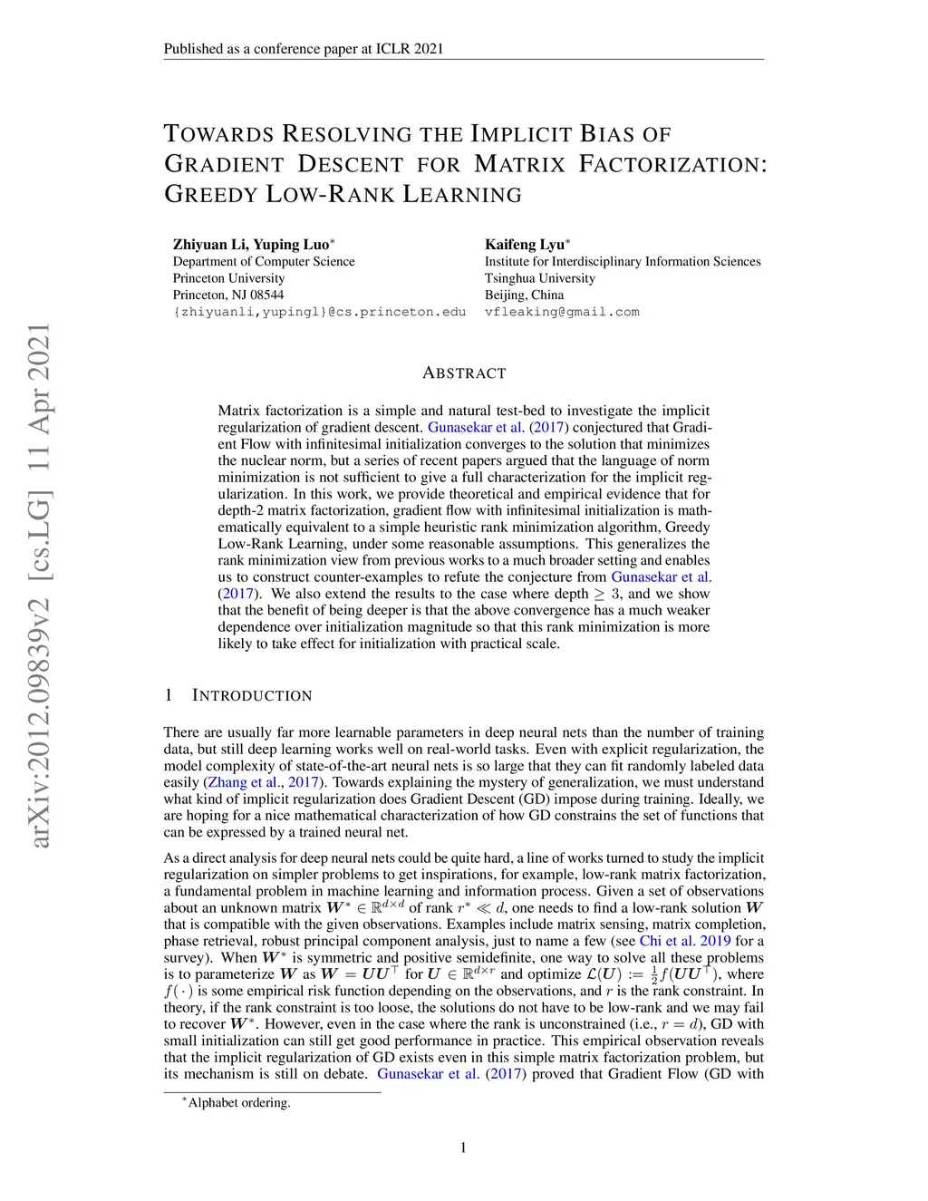 Matrix factorization is a simple and natural test-bed to investigate the implicit regularization of gradient descent. Gunasekar et al. (2018) conjectured that Gradient Flow with infinitesimal initialization converges to the solution that minimizes the nuclear norm, but a series of recent papers argued that the language of norm minimization is not sufficient to give a full characterization for the implicit regularization. In this work, we provide theoretical and empirical evidence that for depth-2 matrix factorization, gradient flow with infinitesimal initialization is mathematically equivalent to a simple heuristic rank minimization algorithm, Greedy Low-Rank Learning, under some reasonable assumptions. This generalizes the rank minimization view from previous works to a much broader setting and enables us to construct counter-examples to refute the conjecture from Gunasekar et al. (2018). We also extend the results to the case where depth , and we show that the benefit of being deeper is that the above convergence has a much weaker dependence over initialization magnitude so that this rank minimization is more likely to take effect for initialization with practical scale.