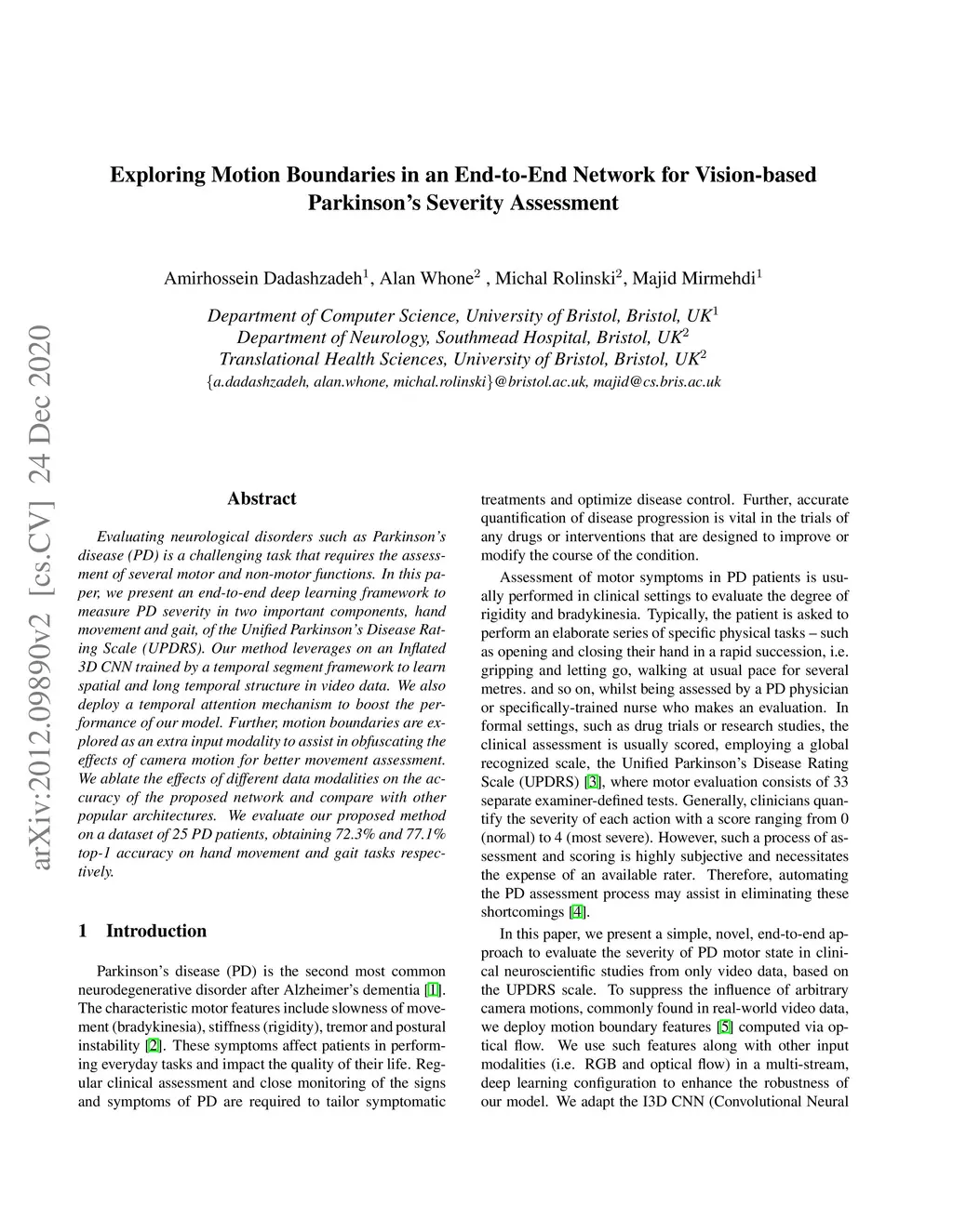 Evaluating neurological disorders such as Parkinson's disease (PD) is a challenging task that requires the assessment of several motor and non-motor functions. In this paper, we present an end-to-end deep learning framework to measure PD severity in two important components, hand movement and gait, of the Unified Parkinson's Disease Rating Scale (UPDRS). Our method leverages on an Inflated 3D CNN trained by a temporal segment framework to learn spatial and long temporal structure in video data. We also deploy a temporal attention mechanism to boost the performance of our model. Further, motion boundaries are explored as an extra input modality to assist in obfuscating the effects of camera motion for better movement assessment. We ablate the effects of different data modalities on the accuracy of the proposed network and compare with other popular architectures. We evaluate our proposed method on a dataset of 25 PD patients, obtaining 72.3% and 77.1% top-1 accuracy on hand movement and gait tasks respectively.