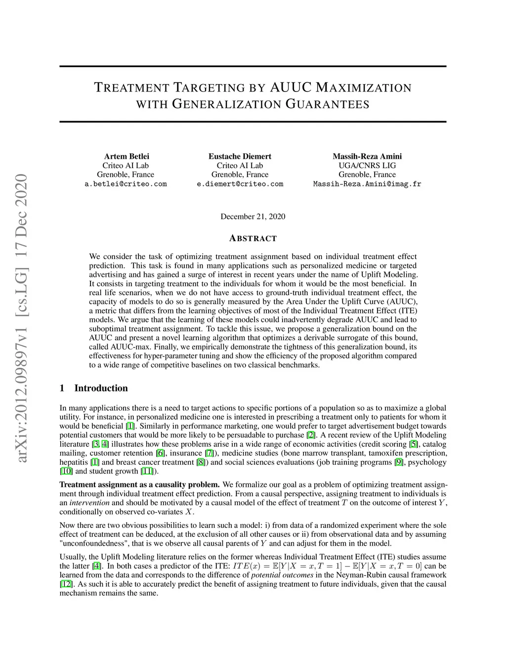 We consider the task of optimizing treatment assignment based on individual treatment effect prediction. This task is found in many applications such as personalized medicine or targeted advertising and has gained a surge of interest in recent years under the name of Uplift Modeling. It consists in targeting treatment to the individuals for whom it would be the most beneficial. In real life scenarios, when we do not have access to ground-truth individual treatment effect, the capacity of models to do so is generally measured by the Area Under the Uplift Curve (AUUC), a metric that differs from the learning objectives of most of the Individual Treatment Effect (ITE) models. We argue that the learning of these models could inadvertently degrade AUUC and lead to suboptimal treatment assignment. To tackle this issue, we propose a generalization bound on the AUUC and present a novel learning algorithm that optimizes a derivable surrogate of this bound, called AUUC-max. Finally, we empirically demonstrate the tightness of this generalization bound, its effectiveness for hyper-parameter tuning and show the efficiency of the proposed algorithm compared to a wide range of competitive baselines on two classical benchmarks.