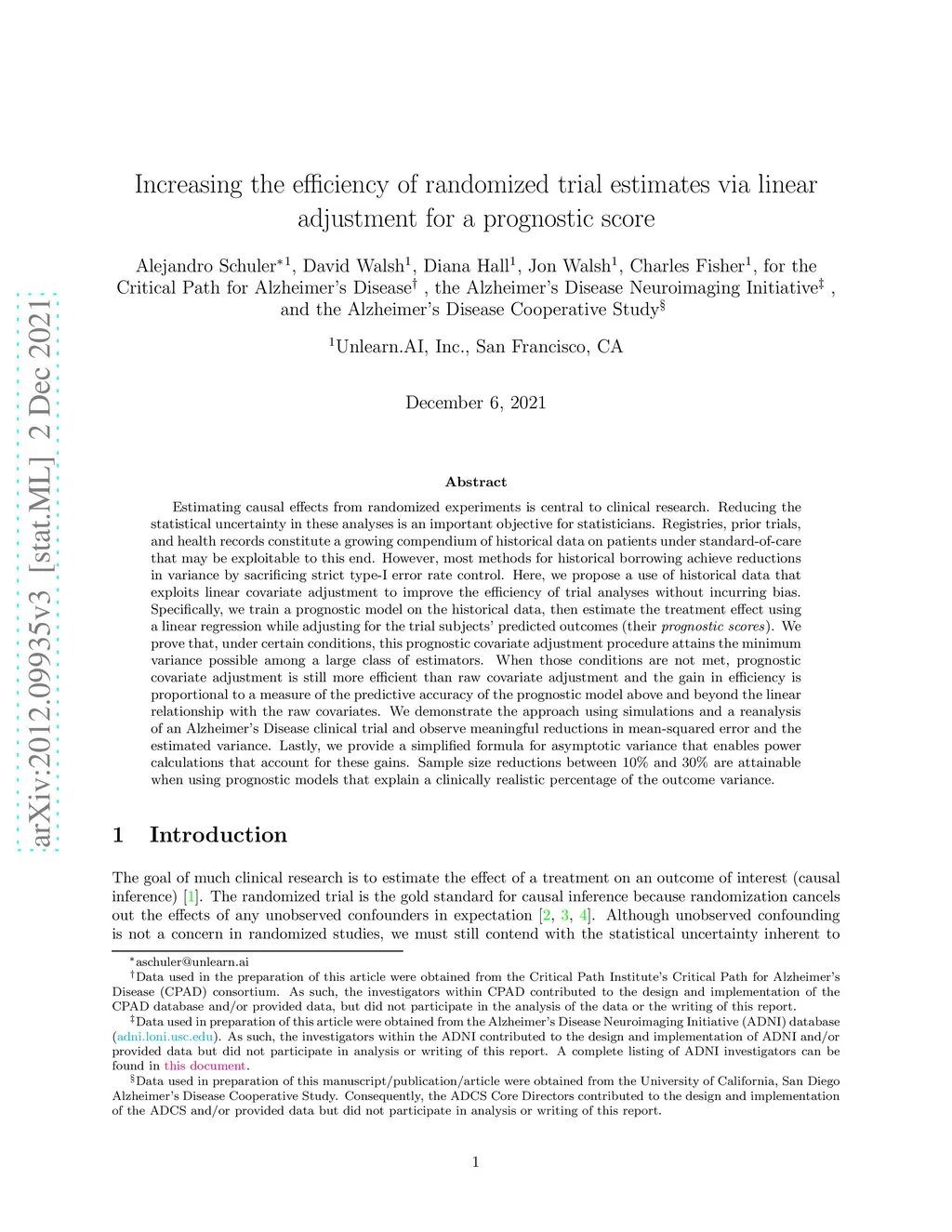 Estimating causal effects from randomized experiments is central to clinical research. Reducing the statistical uncertainty in these analyses is an important objective for statisticians. Registries, prior trials, and health records constitute a growing compendium of historical data on patients under standard-of-care that may be exploitable to this end. However, most methods for historical borrowing achieve reductions in variance by sacrificing strict type-I error rate control. Here, we propose a use of historical data that exploits linear covariate adjustment to improve the efficiency of trial analyses without incurring bias. Specifically, we train a prognostic model on the historical data, then estimate the treatment effect using a linear regression while adjusting for the trial subjects' predicted outcomes (their prognostic scores). We prove that, under certain conditions, this prognostic covariate adjustment procedure attains the minimum variance possible among a large class of estimators. When those conditions are not met, prognostic covariate adjustment is still more efficient than raw covariate adjustment and the gain in efficiency is proportional to a measure of the predictive accuracy of the prognostic model above and beyond the linear relationship with the raw covariates. We demonstrate the approach using simulations and a reanalysis of an Alzheimer's Disease clinical trial and observe meaningful reductions in mean-squared error and the estimated variance. Lastly, we provide a simplified formula for asymptotic variance that enables power calculations that account for these gains. Sample size reductions between 10% and 30% are attainable when using prognostic models that explain a clinically realistic percentage of the outcome variance.