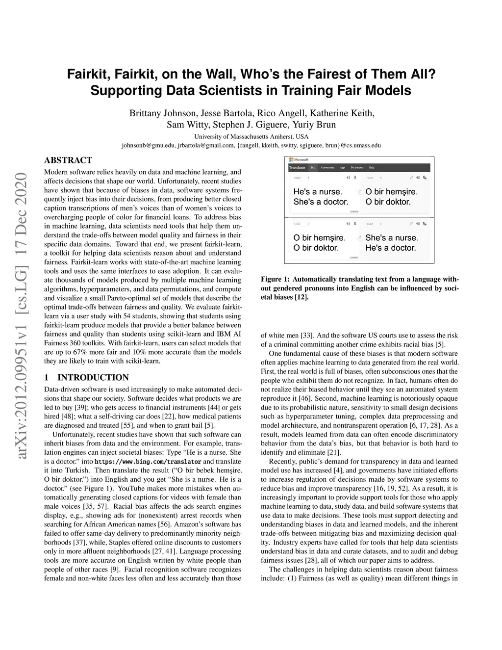 Modern software relies heavily on data and machine learning, and affects decisions that shape our world. Unfortunately, recent studies have shown that because of biases in data, software systems frequently inject bias into their decisions, from producing better closed caption transcriptions of men's voices than of women's voices to overcharging people of color for financial loans. To address bias in machine learning, data scientists need tools that help them understand the trade-offs between model quality and fairness in their specific data domains. Toward that end, we present fairkit-learn, a toolkit for helping data scientists reason about and understand fairness. Fairkit-learn works with state-of-the-art machine learning tools and uses the same interfaces to ease adoption. It can evaluate thousands of models produced by multiple machine learning algorithms, hyperparameters, and data permutations, and compute and visualize a small Pareto-optimal set of models that describe the optimal trade-offs between fairness and quality. We evaluate fairkit-learn via a user study with 54 students, showing that students using fairkit-learn produce models that provide a better balance between fairness and quality than students using scikit-learn and IBM AI Fairness 360 toolkits. With fairkit-learn, users can select models that are up to 67% more fair and 10% more accurate than the models they are likely to train with scikit-learn.