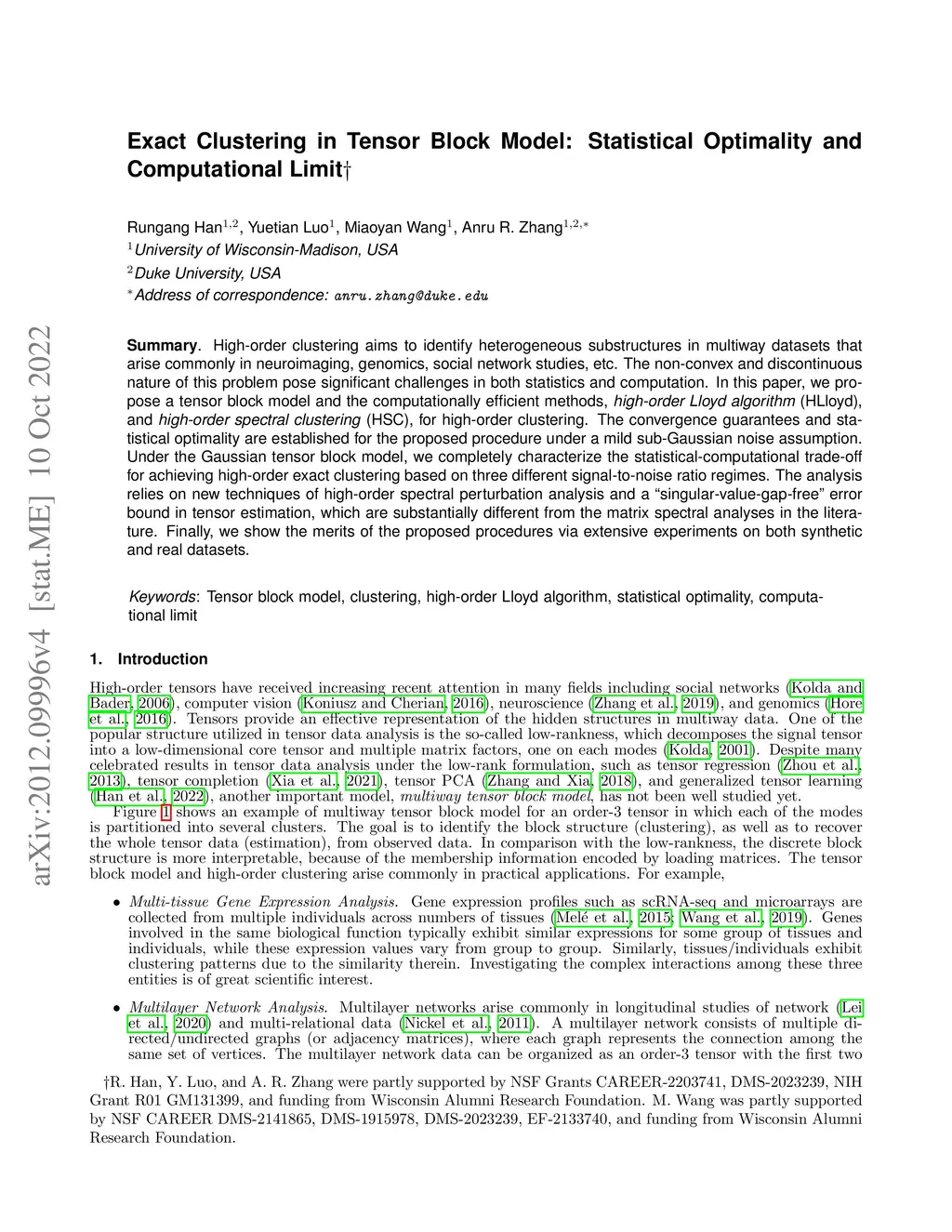 High-order clustering aims to identify heterogeneous substructures in multiway datasets that arise commonly in neuroimaging, genomics, social network studies, etc. The non-convex and discontinuous nature of this problem pose significant challenges in both statistics and computation. In this paper, we propose a tensor block model and the computationally efficient methods, \emph{high-order Lloyd algorithm} (HLloyd), and high-order spectral clustering (HSC), for high-order clustering. The convergence guarantees and statistical optimality are established for the proposed procedure under a mild sub-Gaussian noise assumption. Under the Gaussian tensor block model, we completely characterize the statistical-computational trade-off for achieving high-order exact clustering based on three different signal-to-noise ratio regimes. The analysis relies on new techniques of high-order spectral perturbation analysis and a ``singular-value-gap-free'' error bound in tensor estimation, which are substantially different from the matrix spectral analyses in the literature. Finally, we show the merits of the proposed procedures via extensive experiments on both synthetic and real datasets.