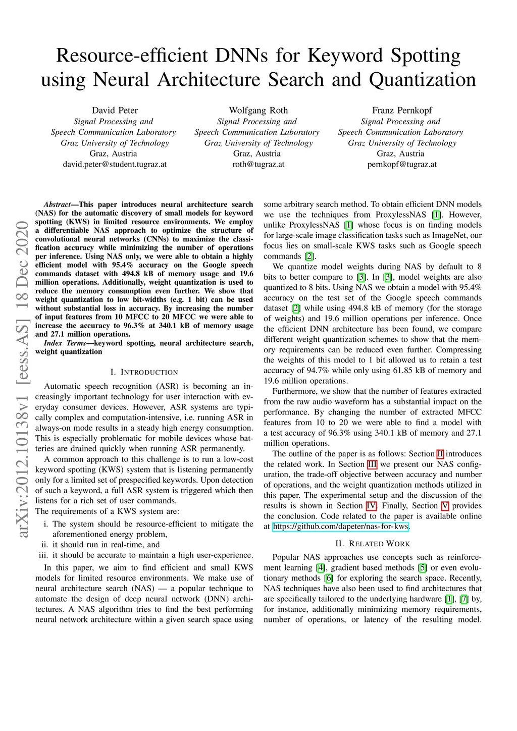 Resource-efficient DNNs for Keyword Spotting using Neural Architecture