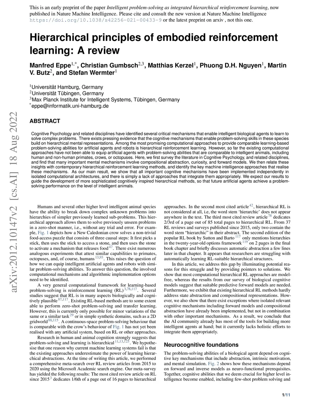 Hierarchical principles of embodied reinforcement learning: A review