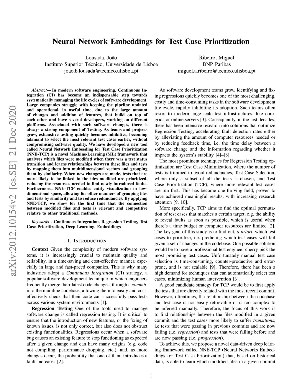 In modern software engineering, Continuous Integration (CI) has become an indispensable step towards systematically managing the life cycles of software development. Large companies struggle with keeping the pipeline updated and operational, in useful time, due to the large amount of changes and addition of features, that build on top of each other and have several developers, working on different platforms. Associated with such software changes, there is always a strong component of Testing. As teams and projects grow, exhaustive testing quickly becomes inhibitive, becoming adamant to select the most relevant test cases earlier, without compromising software quality. We have developed a new tool called Neural Network Embeeding for Test Case Prioritization (NNE-TCP) is a novel Machine-Learning (ML) framework that analyses which files were modified when there was a test status transition and learns relationships between these files and tests by mapping them into multidimensional vectors and grouping them by similarity. When new changes are made, tests that are more likely to be linked to the files modified are prioritized, reducing the resources needed to find newly introduced faults. Furthermore, NNE-TCP enables entity visualization in low-dimensional space, allowing for other manners of grouping files and tests by similarity and to reduce redundancies. By applying NNE-TCP, we show for the first time that the connection between modified files and tests is relevant and competitive relative to other traditional methods.