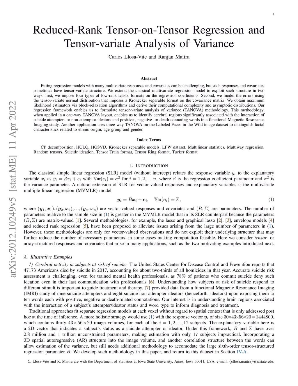 Fitting regression models with many multivariate responses and covariates can be challenging, but such responses and covariates sometimes have tensor-variate structure. We extend the classical multivariate regression model to exploit such structure in two ways: first, we impose four types of low-rank tensor formats on the regression coefficients. Second, we model the errors using the tensor-variate normal distribution that imposes a Kronecker separable format on the covariance matrix. We obtain maximum likelihood estimators via block-relaxation algorithms and derive their computational complexity and asymptotic distributions. Our regression framework enables us to formulate tensor-variate analysis of variance (TANOVA) methodology. This methodology, when applied in a one-way TANOVA layout, enables us to identify cerebral regions significantly associated with the interaction of suicide attempters or non-attemptor ideators and positive-, negative- or death-connoting words in a functional Magnetic Resonance Imaging study. Another application uses three-way TANOVA on the Labeled Faces in the Wild image dataset to distinguish facial characteristics related to ethnic origin, age group and gender.