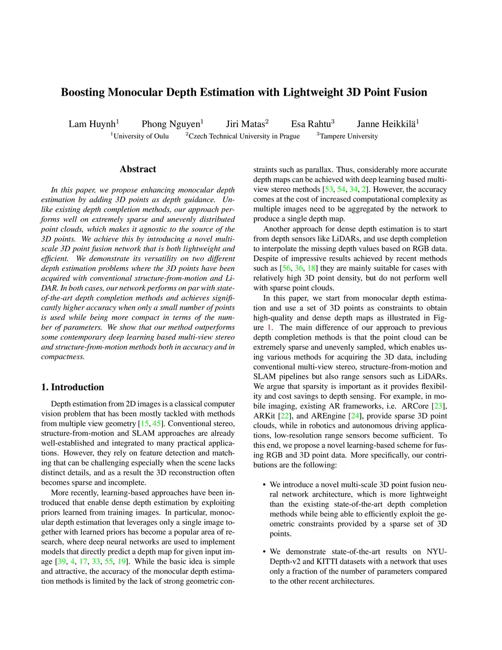 In this paper, we propose enhancing monocular depth estimation by adding 3D points as depth guidance. Unlike existing depth completion methods, our approach performs well on extremely sparse and unevenly distributed point clouds, which makes it agnostic to the source of the 3D points. We achieve this by introducing a novel multi-scale 3D point fusion network that is both lightweight and efficient. We demonstrate its versatility on two different depth estimation problems where the 3D points have been acquired with conventional structure-from-motion and LiDAR. In both cases, our network performs on par with state-of-the-art depth completion methods and achieves significantly higher accuracy when only a small number of points is used while being more compact in terms of the number of parameters. We show that our method outperforms some contemporary deep learning based multi-view stereo and structure-from-motion methods both in accuracy and in compactness.