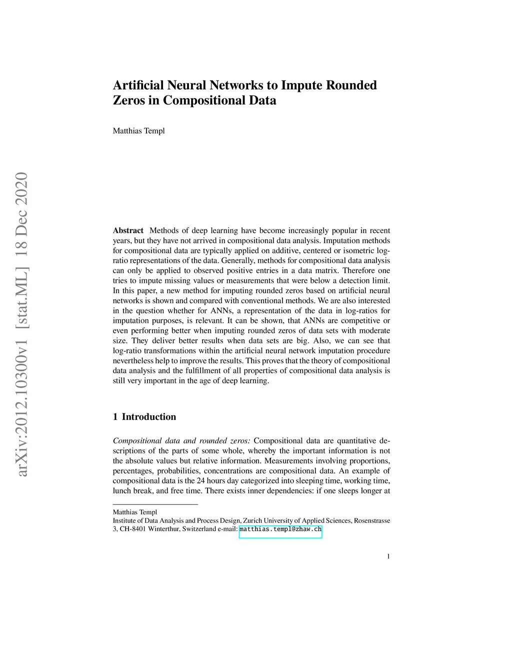 Methods of deep learning have become increasingly popular in recent years, but they have not arrived in compositional data analysis. Imputation methods for compositional data are typically applied on additive, centered or isometric log-ratio representations of the data. Generally, methods for compositional data analysis can only be applied to observed positive entries in a data matrix. Therefore one tries to impute missing values or measurements that were below a detection limit. In this paper, a new method for imputing rounded zeros based on artificial neural networks is shown and compared with conventional methods. We are also interested in the question whether for ANNs, a representation of the data in log-ratios for imputation purposes, is relevant. It can be shown, that ANNs are competitive or even performing better when imputing rounded zeros of data sets with moderate size. They deliver better results when data sets are big. Also, we can see that log-ratio transformations within the artificial neural network imputation procedure nevertheless help to improve the results. This proves that the theory of compositional data analysis and the fulfillment of all properties of compositional data analysis is still very important in the age of deep learning.