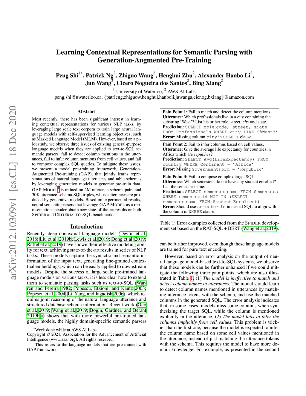 Most recently, there has been significant interest in learning contextual representations for various NLP tasks, by leveraging large scale text corpora to train large neural language models with self-supervised learning objectives, such as Masked Language Model (MLM). However, based on a pilot study, we observe three issues of existing general-purpose language models when they are applied to text-to-SQL semantic parsers: fail to detect column mentions in the utterances, fail to infer column mentions from cell values, and fail to compose complex SQL queries. To mitigate these issues, we present a model pre-training framework, Generation-Augmented Pre-training (GAP), that jointly learns representations of natural language utterances and table schemas by leveraging generation models to generate pre-train data. GAP MODEL is trained on 2M utterance-schema pairs and 30K utterance-schema-SQL triples, whose utterances are produced by generative models. Based on experimental results, neural semantic parsers that leverage GAP MODEL as a representation encoder obtain new state-of-the-art results on both SPIDER and CRITERIA-TO-SQL benchmarks.