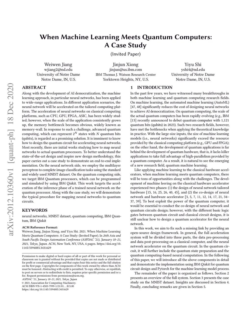 Along with the development of AI democratization, the machine learning approach, in particular neural networks, has been applied to wide-range applications. In different application scenarios, the neural network will be accelerated on the tailored computing platform. The acceleration of neural networks on classical computing platforms, such as CPU, GPU, FPGA, ASIC, has been widely studied; however, when the scale of the application consistently grows up, the memory bottleneck becomes obvious, widely known as memory-wall. In response to such a challenge, advanced quantum computing, which can represent 2^N states with N quantum bits (qubits), is regarded as a promising solution. It is imminent to know how to design the quantum circuit for accelerating neural networks. Most recently, there are initial works studying how to map neural networks to actual quantum processors. To better understand the state-of-the-art design and inspire new design methodology, this paper carries out a case study to demonstrate an end-to-end implementation. On the neural network side, we employ the multilayer perceptron to complete image classification tasks using the standard and widely used MNIST dataset. On the quantum computing side, we target IBM Quantum processors, which can be programmed and simulated by using IBM Qiskit. This work targets the acceleration of the inference phase of a trained neural network on the quantum processor. Along with the case study, we will demonstrate the typical procedure for mapping neural networks to quantum circuits.