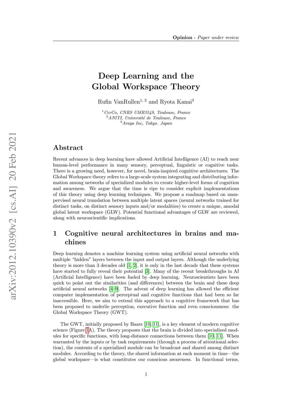 Recent advances in deep learning have allowed Artificial Intelligence (AI) to reach near human-level performance in many sensory, perceptual, linguistic or cognitive tasks. There is a growing need, however, for novel, brain-inspired cognitive architectures. The Global Workspace theory refers to a large-scale system integrating and distributing information among networks of specialized modules to create higher-level forms of cognition and awareness. We argue that the time is ripe to consider explicit implementations of this theory using deep learning techniques. We propose a roadmap based on unsupervised neural translation between multiple latent spaces (neural networks trained for distinct tasks, on distinct sensory inputs and/or modalities) to create a unique, amodal global latent workspace (GLW). Potential functional advantages of GLW are reviewed, along with neuroscientific implications.
