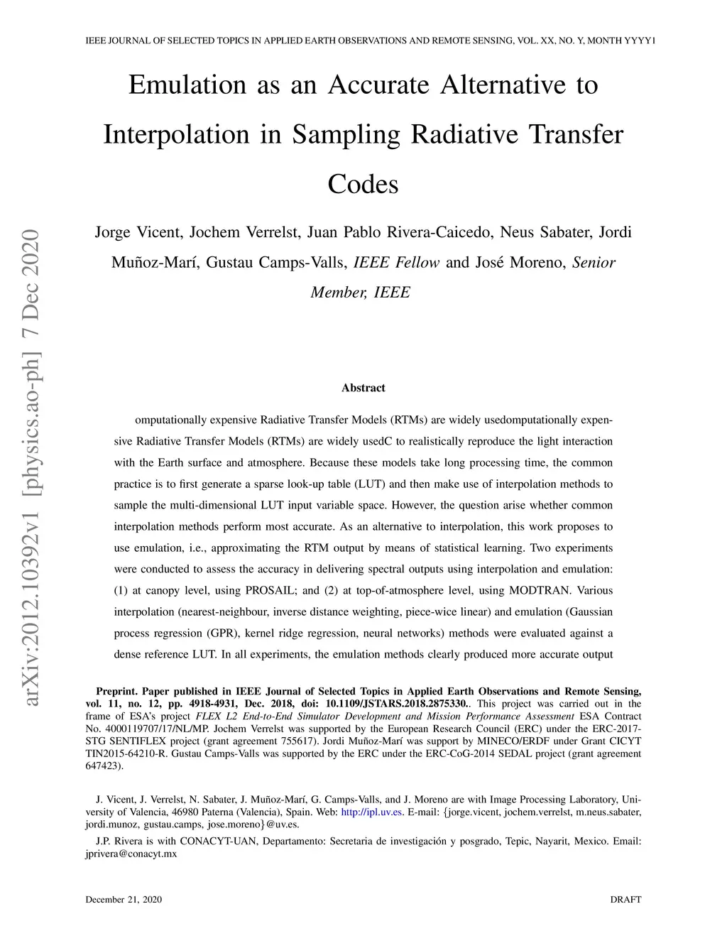 Computationally expensive Radiative Transfer Models (RTMs) are widely used} to realistically reproduce the light interaction with the Earth surface and atmosphere. Because these models take long processing time, the common practice is to first generate a sparse look-up table (LUT) and then make use of interpolation methods to sample the multi-dimensional LUT input variable space. However, the question arise whether common interpolation methods perform most accurate. As an alternative to interpolation, this work proposes to use emulation, i.e., approximating the RTM output by means of statistical learning. Two experiments were conducted to assess the accuracy in delivering spectral outputs using interpolation and emulation: (1) at canopy level, using PROSAIL; and (2) at top-of-atmosphere level, using MODTRAN. Various interpolation (nearest-neighbour, inverse distance weighting, piece-wice linear) and emulation (Gaussian process regression (GPR), kernel ridge regression, neural networks) methods were evaluated against a dense reference LUT. In all experiments, the emulation methods clearly produced more accurate output spectra than classical interpolation methods. GPR emulation performed up to ten times more accurately than the best performing interpolation method, and this with a speed that is competitive with the faster interpolation methods. It is concluded that emulation can function as a fast and more accurate alternative to commonly used interpolation methods for reconstructing RTM spectral data.