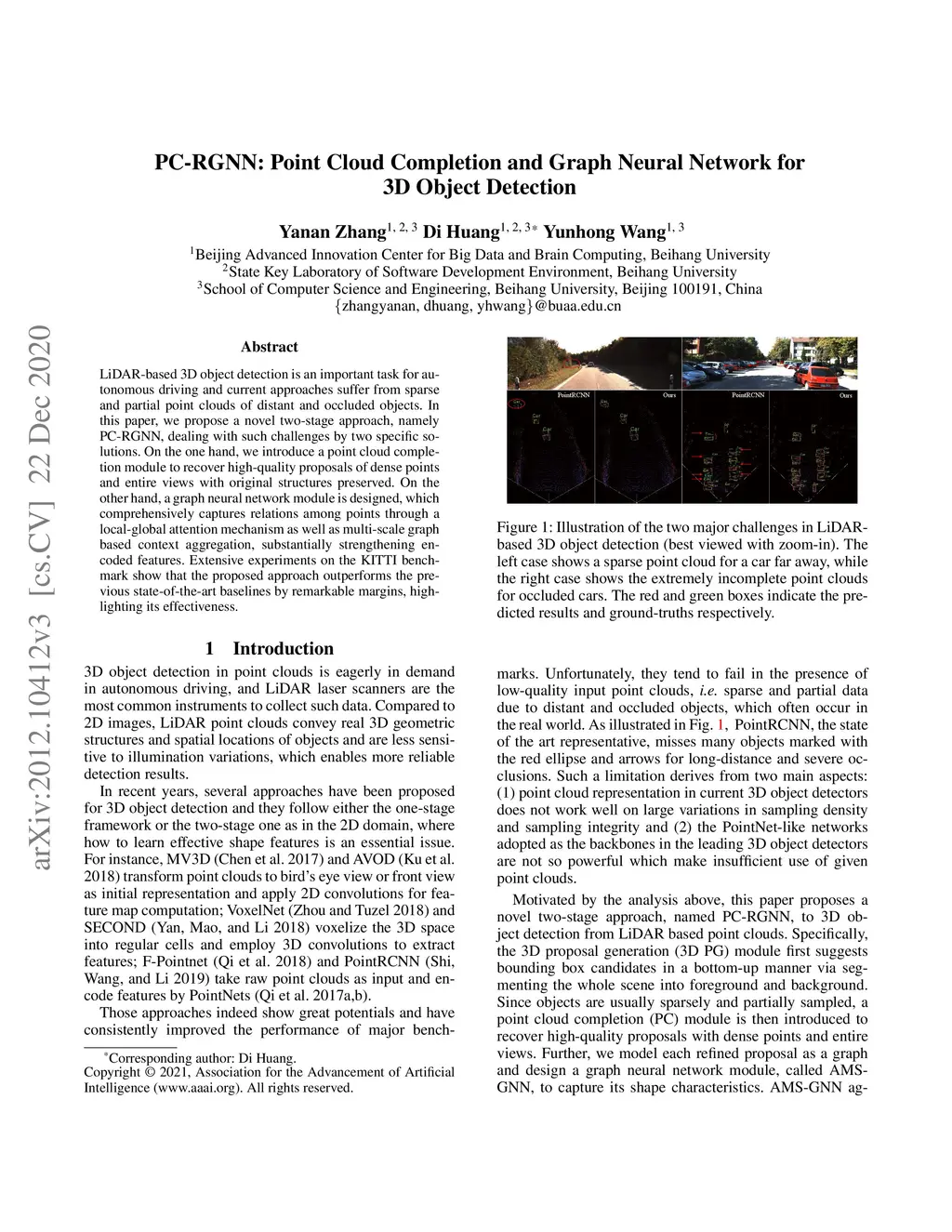 LiDAR-based 3D object detection is an important task for autonomous driving and current approaches suffer from sparse and partial point clouds of distant and occluded objects. In this paper, we propose a novel two-stage approach, namely PC-RGNN, dealing with such challenges by two specific solutions. On the one hand, we introduce a point cloud completion module to recover high-quality proposals of dense points and entire views with original structures preserved. On the other hand, a graph neural network module is designed, which comprehensively captures relations among points through a local-global attention mechanism as well as multi-scale graph based context aggregation, substantially strengthening encoded features. Extensive experiments on the KITTI benchmark show that the proposed approach outperforms the previous state-of-the-art baselines by remarkable margins, highlighting its effectiveness.