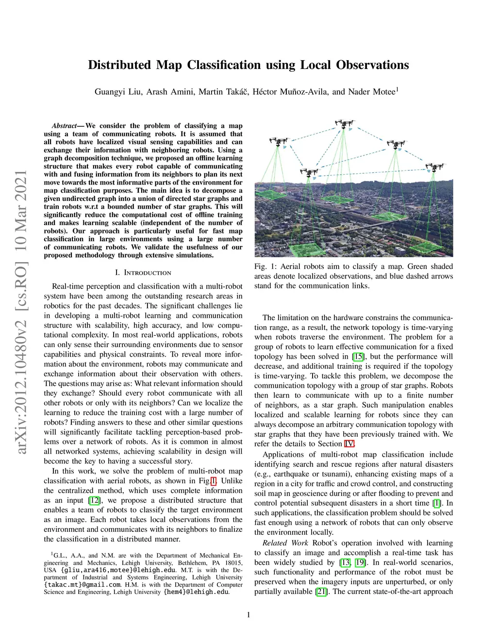We consider the problem of classifying a map using a team of communicating robots. It is assumed that all robots have localized visual sensing capabilities and can exchange their information with neighboring robots. Using a graph decomposition technique, we proposed an offline learning structure that makes every robot capable of communicating with and fusing information from its neighbors to plan its next move towards the most informative parts of the environment for map classification purposes. The main idea is to decompose a given undirected graph into a union of directed star graphs and train robots w.r.t a bounded number of star graphs. This will significantly reduce the computational cost of offline training and makes learning scalable (independent of the number of robots). Our approach is particularly useful for fast map classification in large environments using a large number of communicating robots. We validate the usefulness of our proposed methodology through extensive simulations.