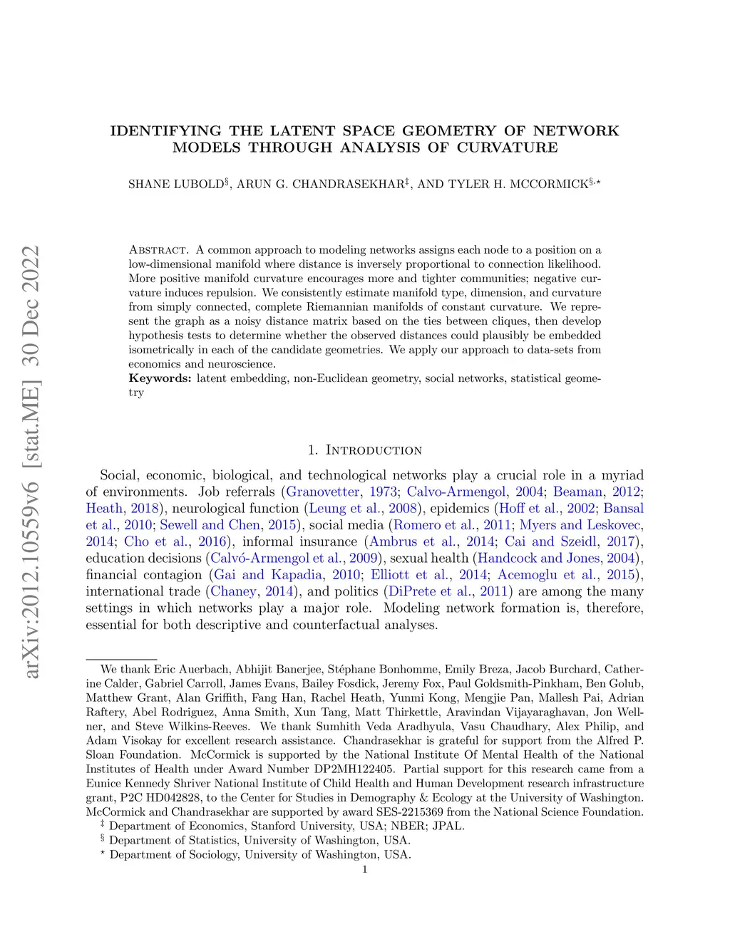 A common approach to modeling networks assigns each node to a position on a low-dimensional manifold where distance is inversely proportional to connection likelihood. More positive manifold curvature encourages more and tighter communities; negative curvature induces repulsion. We consistently estimate manifold type, dimension, and curvature from simply connected, complete Riemannian manifolds of constant curvature. We represent the graph as a noisy distance matrix based on the ties between cliques, then develop hypothesis tests to determine whether the observed distances could plausibly be embedded isometrically in each of the candidate geometries. We apply our approach to data-sets from economics and neuroscience.