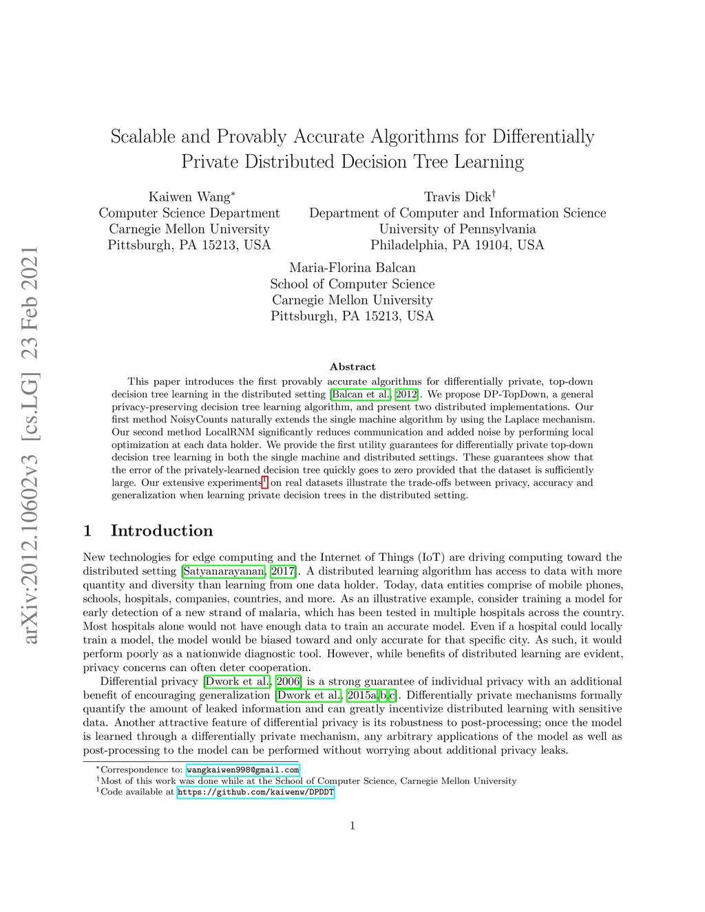 This paper introduces the first provably accurate algorithms for differentially private, top-down decision tree learning in the distributed setting (Balcan et al., 2012). We propose DP-TopDown, a general privacy preserving decision tree learning algorithm, and present two distributed implementations. Our first method NoisyCounts naturally extends the single machine algorithm by using the Laplace mechanism. Our second method LocalRNM significantly reduces communication and added noise by performing local optimization at each data holder. We provide the first utility guarantees for differentially private top-down decision tree learning in both the single machine and distributed settings. These guarantees show that the error of the privately-learned decision tree quickly goes to zero provided that the dataset is sufficiently large. Our extensive experiments on real datasets illustrate the trade-offs of privacy, accuracy and generalization when learning private decision trees in the distributed setting.