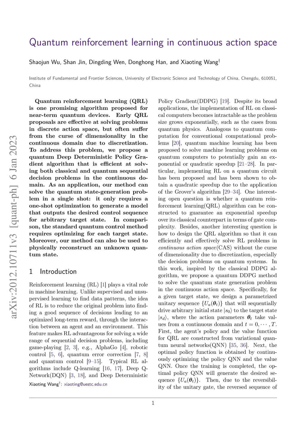 Quantum reinforcement learning (QRL) is a promising paradigm for near-term quantum devices. While existing QRL methods have shown success in discrete action spaces, extending these techniques to continuous domains is challenging due to the curse of dimensionality introduced by discretization. To overcome this limitation, we introduce a quantum Deep Deterministic Policy Gradient (DDPG) algorithm that efficiently addresses both classical and quantum sequential decision problems in continuous action spaces. Moreover, our approach facilitates single-shot quantum state generation: a one-time optimization produces a model that outputs the control sequence required to drive a fixed initial state to any desired target state. In contrast, conventional quantum control methods demand separate optimization for each target state. We demonstrate the effectiveness of our method through simulations and discuss its potential applications in quantum control.