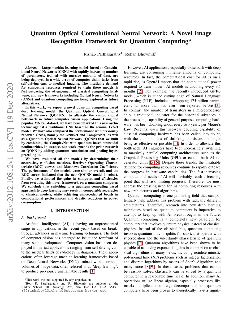 Large machine learning models based on Convolutional Neural Networks (CNNs) with rapidly increasing number of parameters, trained with massive amounts of data, are being deployed in a wide array of computer vision tasks from self-driving cars to medical imaging. The insatiable demand for computing resources required to train these models is fast outpacing the advancement of classical computing hardware, and new frameworks including Optical Neural Networks (ONNs) and quantum computing are being explored as future alternatives. In this work, we report a novel quantum computing based deep learning model, the Quantum Optical Convolutional Neural Network (QOCNN), to alleviate the computational bottleneck in future computer vision applications. Using the popular MNIST dataset, we have benchmarked this new architecture against a traditional CNN based on the seminal LeNet model. We have also compared the performance with previously reported ONNs, namely the GridNet and ComplexNet, as well as a Quantum Optical Neural Network (QONN) that we built by combining the ComplexNet with quantum based sinusoidal nonlinearities. In essence, our work extends the prior research on QONN by adding quantum convolution and pooling layers preceding it. We have evaluated all the models by determining their accuracies, confusion matrices, Receiver Operating Characteristic (ROC) curves, and Matthews Correlation Coefficients. The performance of the models were similar overall, and the ROC curves indicated that the new QOCNN model is robust. Finally, we estimated the gains in computational efficiencies from executing this novel framework on a quantum computer. We conclude that switching to a quantum computing based approach to deep learning may result in comparable accuracies to classical models, while achieving unprecedented boosts in computational performances and drastic reduction in power consumption.