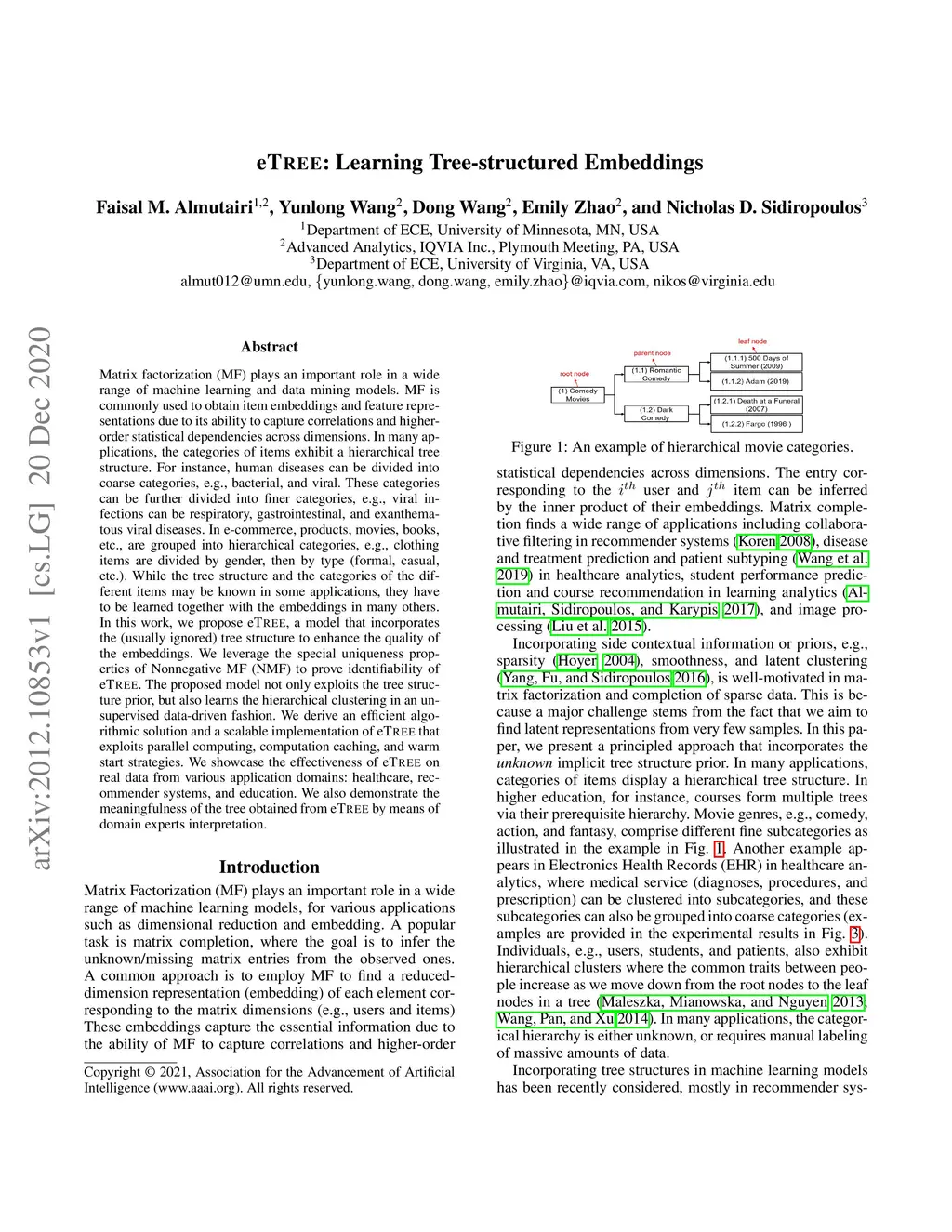 Matrix factorization (MF) plays an important role in a wide range of machine learning and data mining models. MF is commonly used to obtain item embeddings and feature representations due to its ability to capture correlations and higher-order statistical dependencies across dimensions. In many applications, the categories of items exhibit a hierarchical tree structure. For instance, human diseases can be divided into coarse categories, e.g., bacterial, and viral. These categories can be further divided into finer categories, e.g., viral infections can be respiratory, gastrointestinal, and exanthematous viral diseases. In e-commerce, products, movies, books, etc., are grouped into hierarchical categories, e.g., clothing items are divided by gender, then by type (formal, casual, etc.). While the tree structure and the categories of the different items may be known in some applications, they have to be learned together with the embeddings in many others. In this work, we propose eTREE, a model that incorporates the (usually ignored) tree structure to enhance the quality of the embeddings. We leverage the special uniqueness properties of Nonnegative MF (NMF) to prove identifiability of eTREE. The proposed model not only exploits the tree structure prior, but also learns the hierarchical clustering in an unsupervised data-driven fashion. We derive an efficient algorithmic solution and a scalable implementation of eTREE that exploits parallel computing, computation caching, and warm start strategies. We showcase the effectiveness of eTREE on real data from various application domains: healthcare, recommender systems, and education. We also demonstrate the meaningfulness of the tree obtained from eTREE by means of domain experts interpretation.