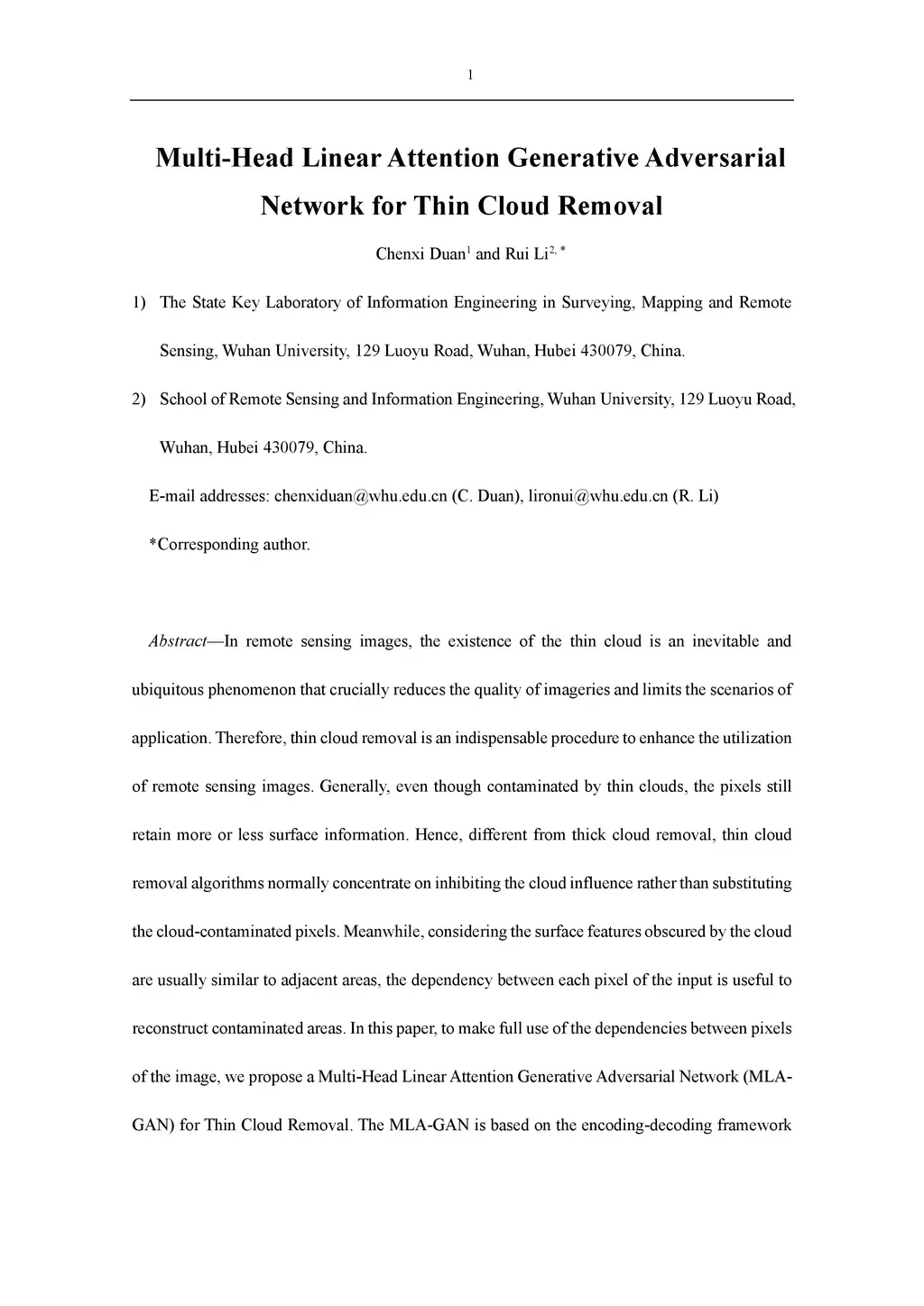 In remote sensing images, the existence of the thin cloud is an inevitable and ubiquitous phenomenon that crucially reduces the quality of imageries and limits the scenarios of application. Therefore, thin cloud removal is an indispensable procedure to enhance the utilization of remote sensing images. Generally, even though contaminated by thin clouds, the pixels still retain more or less surface information. Hence, different from thick cloud removal, thin cloud removal algorithms normally concentrate on inhibiting the cloud influence rather than substituting the cloud-contaminated pixels. Meanwhile, considering the surface features obscured by the cloud are usually similar to adjacent areas, the dependency between each pixel of the input is useful to reconstruct contaminated areas. In this paper, to make full use of the dependencies between pixels of the image, we propose a Multi-Head Linear Attention Generative Adversarial Network (MLAGAN) for Thin Cloud Removal. The MLA-GAN is based on the encoding-decoding framework consisting of multiple attention-based layers and deconvolutional layers. Compared with six deep learning-based thin cloud removal benchmarks, the experimental results on the RICE1 and RICE2 datasets demonstrate that the proposed framework MLA-GAN has dominant advantages in thin cloud removal.