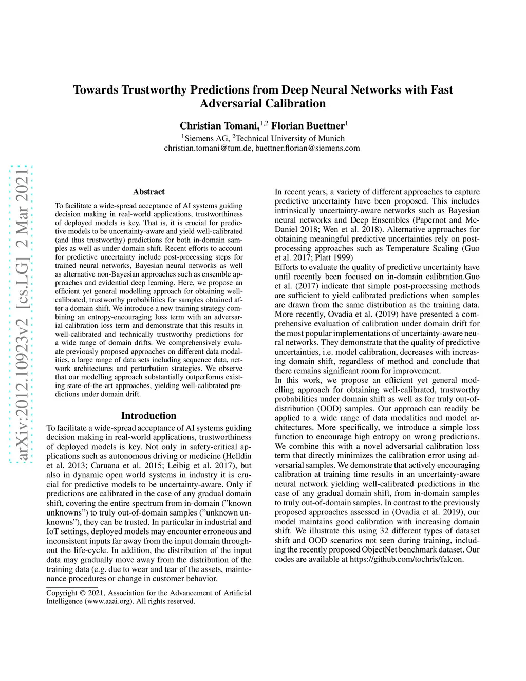 To facilitate a wide-spread acceptance of AI systems guiding decision making in real-world applications, trustworthiness of deployed models is key. That is, it is crucial for predictive models to be uncertainty-aware and yield well-calibrated (and thus trustworthy) predictions for both in-domain samples as well as under domain shift. Recent efforts to account for predictive uncertainty include post-processing steps for trained neural networks, Bayesian neural networks as well as alternative non-Bayesian approaches such as ensemble approaches and evidential deep learning. Here, we propose an efficient yet general modelling approach for obtaining well-calibrated, trustworthy probabilities for samples obtained after a domain shift. We introduce a new training strategy combining an entropy-encouraging loss term with an adversarial calibration loss term and demonstrate that this results in well-calibrated and technically trustworthy predictions for a wide range of domain drifts. We comprehensively evaluate previously proposed approaches on different data modalities, a large range of data sets including sequence data, network architectures and perturbation strategies. We observe that our modelling approach substantially outperforms existing state-of-the-art approaches, yielding well-calibrated predictions under domain drift.