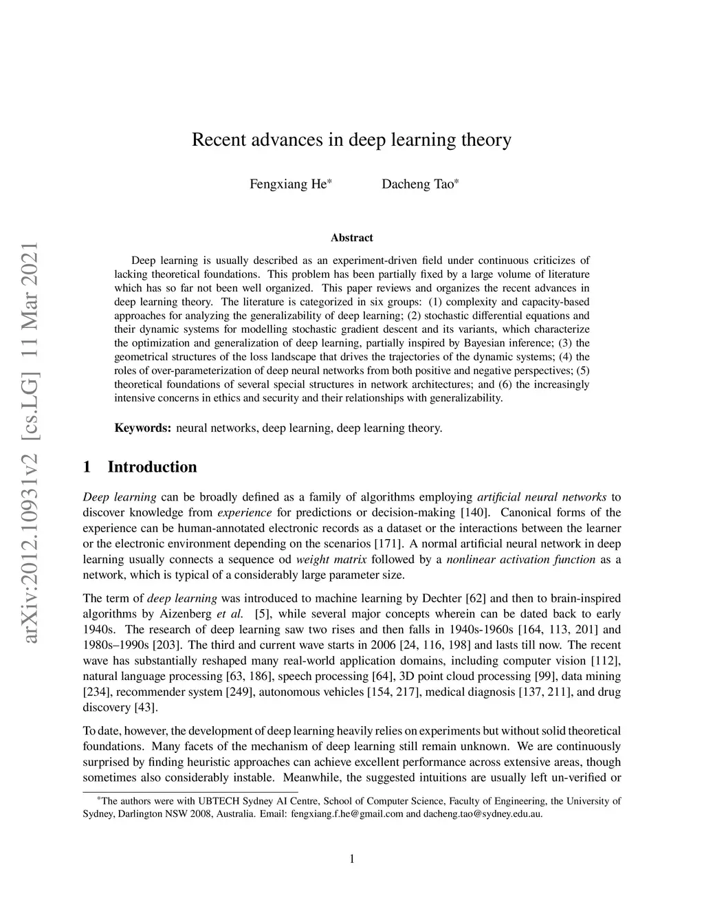 Deep learning is usually described as an experiment-driven field under continuous criticizes of lacking theoretical foundations. This problem has been partially fixed by a large volume of literature which has so far not been well organized. This paper reviews and organizes the recent advances in deep learning theory. The literature is categorized in six groups: (1) complexity and capacity-based approaches for analyzing the generalizability of deep learning; (2) stochastic differential equations and their dynamic systems for modelling stochastic gradient descent and its variants, which characterize the optimization and generalization of deep learning, partially inspired by Bayesian inference; (3) the geometrical structures of the loss landscape that drives the trajectories of the dynamic systems; (4) the roles of over-parameterization of deep neural networks from both positive and negative perspectives; (5) theoretical foundations of several special structures in network architectures; and (6) the increasingly intensive concerns in ethics and security and their relationships with generalizability.