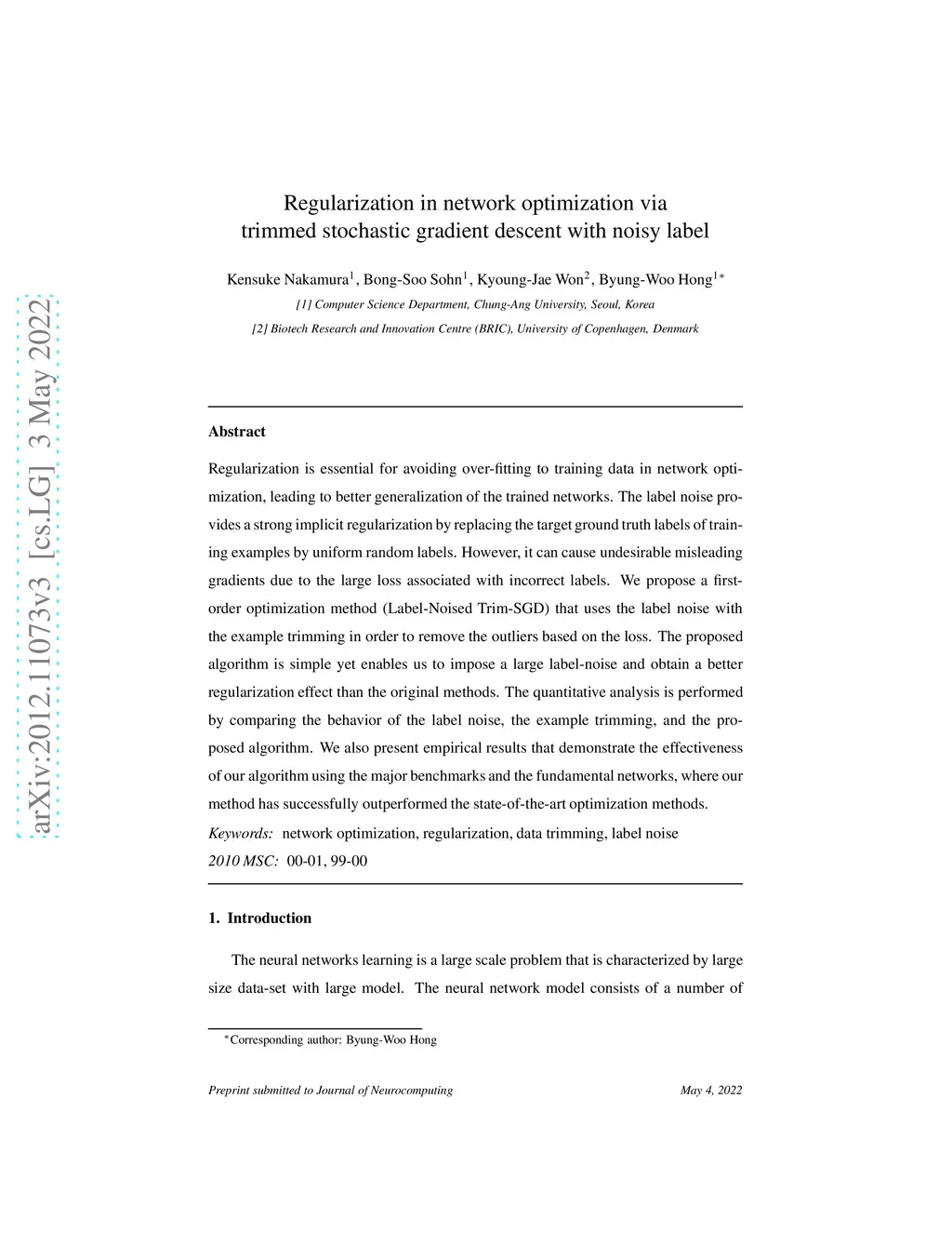 Regularization is essential for avoiding over-fitting to training data in network optimization, leading to better generalization of the trained networks. The label noise provides a strong implicit regularization by replacing the target ground truth labels of training examples by uniform random labels. However, it can cause undesirable misleading gradients due to the large loss associated with incorrect labels. We propose a first-order optimization method (Label-Noised Trim-SGD) that uses the label noise with the example trimming in order to remove the outliers based on the loss. The proposed algorithm is simple yet enables us to impose a large label-noise and obtain a better regularization effect than the original methods. The quantitative analysis is performed by comparing the behavior of the label noise, the example trimming, and the proposed algorithm. We also present empirical results that demonstrate the effectiveness of our algorithm using the major benchmarks and the fundamental networks, where our method has successfully outperformed the state-of-the-art optimization methods.