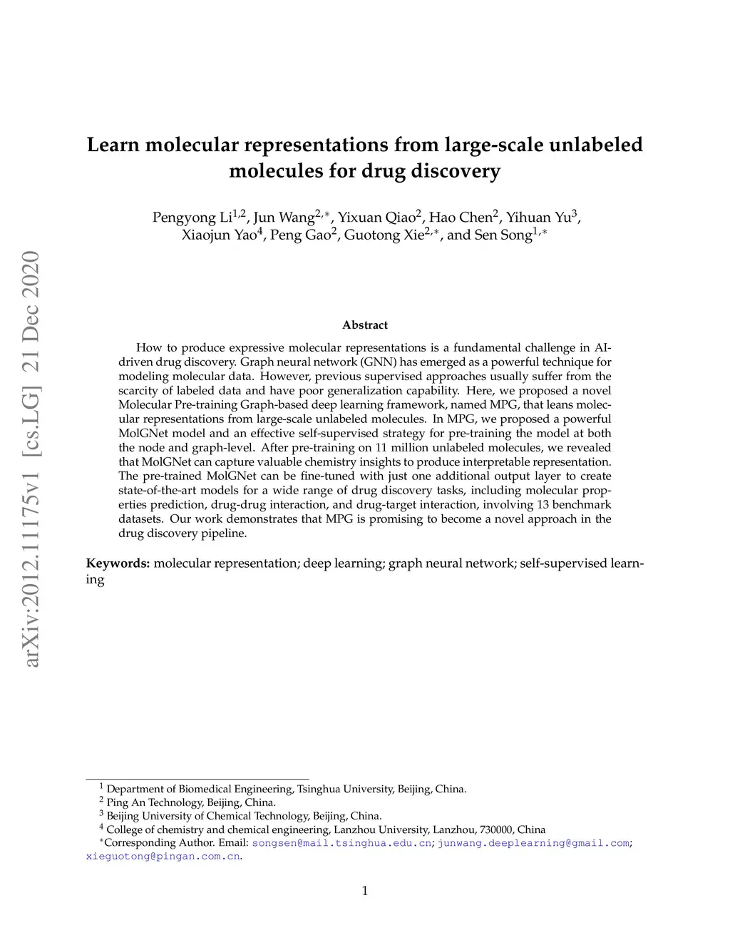 How to produce expressive molecular representations is a fundamental challenge in AI-driven drug discovery. Graph neural network (GNN) has emerged as a powerful technique for modeling molecular data. However, previous supervised approaches usually suffer from the scarcity of labeled data and have poor generalization capability. Here, we proposed a novel Molecular Pre-training Graph-based deep learning framework, named MPG, that leans molecular representations from large-scale unlabeled molecules. In MPG, we proposed a powerful MolGNet model and an effective self-supervised strategy for pre-training the model at both the node and graph-level. After pre-training on 11 million unlabeled molecules, we revealed that MolGNet can capture valuable chemistry insights to produce interpretable representation. The pre-trained MolGNet can be fine-tuned with just one additional output layer to create state-of-the-art models for a wide range of drug discovery tasks, including molecular properties prediction, drug-drug interaction, and drug-target interaction, involving 13 benchmark datasets. Our work demonstrates that MPG is promising to become a novel approach in the drug discovery pipeline.