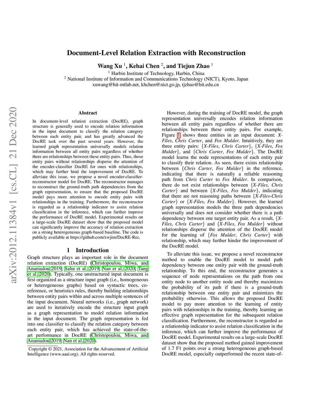 Document-Level Relation Extraction with Reconstruction