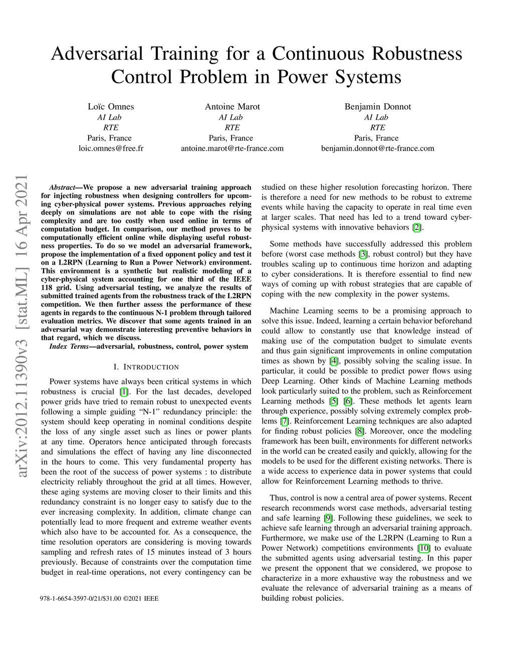 We propose a new adversarial training approach for injecting robustness when designing controllers for upcoming cyber-physical power systems. Previous approaches relying deeply on simulations are not able to cope with the rising complexity and are too costly when used online in terms of computation budget. In comparison, our method proves to be computationally efficient online while displaying useful robustness properties. To do so we model an adversarial framework, propose the implementation of a fixed opponent policy and test it on a L2RPN (Learning to Run a Power Network) environment. This environment is a synthetic but realistic modeling of a cyber-physical system accounting for one third of the IEEE 118 grid. Using adversarial testing, we analyze the results of submitted trained agents from the robustness track of the L2RPN competition. We then further assess the performance of these agents in regards to the continuous N-1 problem through tailored evaluation metrics. We discover that some agents trained in an adversarial way demonstrate interesting preventive behaviors in that regard, which we discuss.