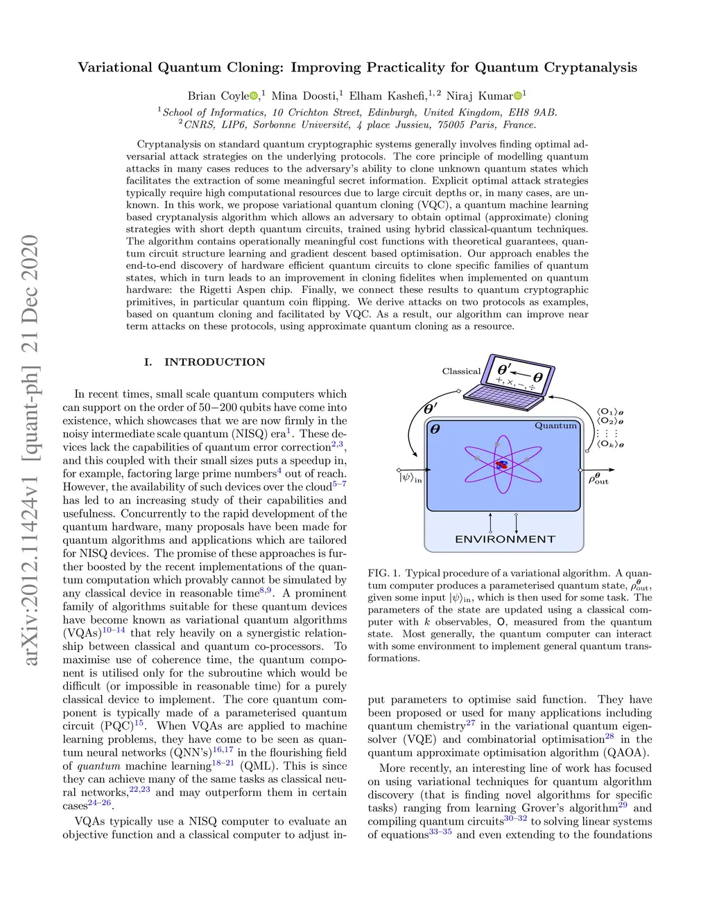 Cryptanalysis on standard quantum cryptographic systems generally involves finding optimal adversarial attack strategies on the underlying protocols. The core principle of modelling quantum attacks in many cases reduces to the adversary's ability to clone unknown quantum states which facilitates the extraction of some meaningful secret information. Explicit optimal attack strategies typically require high computational resources due to large circuit depths or, in many cases, are unknown. In this work, we propose variational quantum cloning (VQC), a quantum machine learning based cryptanalysis algorithm which allows an adversary to obtain optimal (approximate) cloning strategies with short depth quantum circuits, trained using hybrid classical-quantum techniques. The algorithm contains operationally meaningful cost functions with theoretical guarantees, quantum circuit structure learning and gradient descent based optimisation. Our approach enables the end-to-end discovery of hardware efficient quantum circuits to clone specific families of quantum states, which in turn leads to an improvement in cloning fidelites when implemented on quantum hardware: the Rigetti Aspen chip. Finally, we connect these results to quantum cryptographic primitives, in particular quantum coin flipping. We derive attacks on two protocols as examples, based on quantum cloning and facilitated by VQC. As a result, our algorithm can improve near term attacks on these protocols, using approximate quantum cloning as a resource.