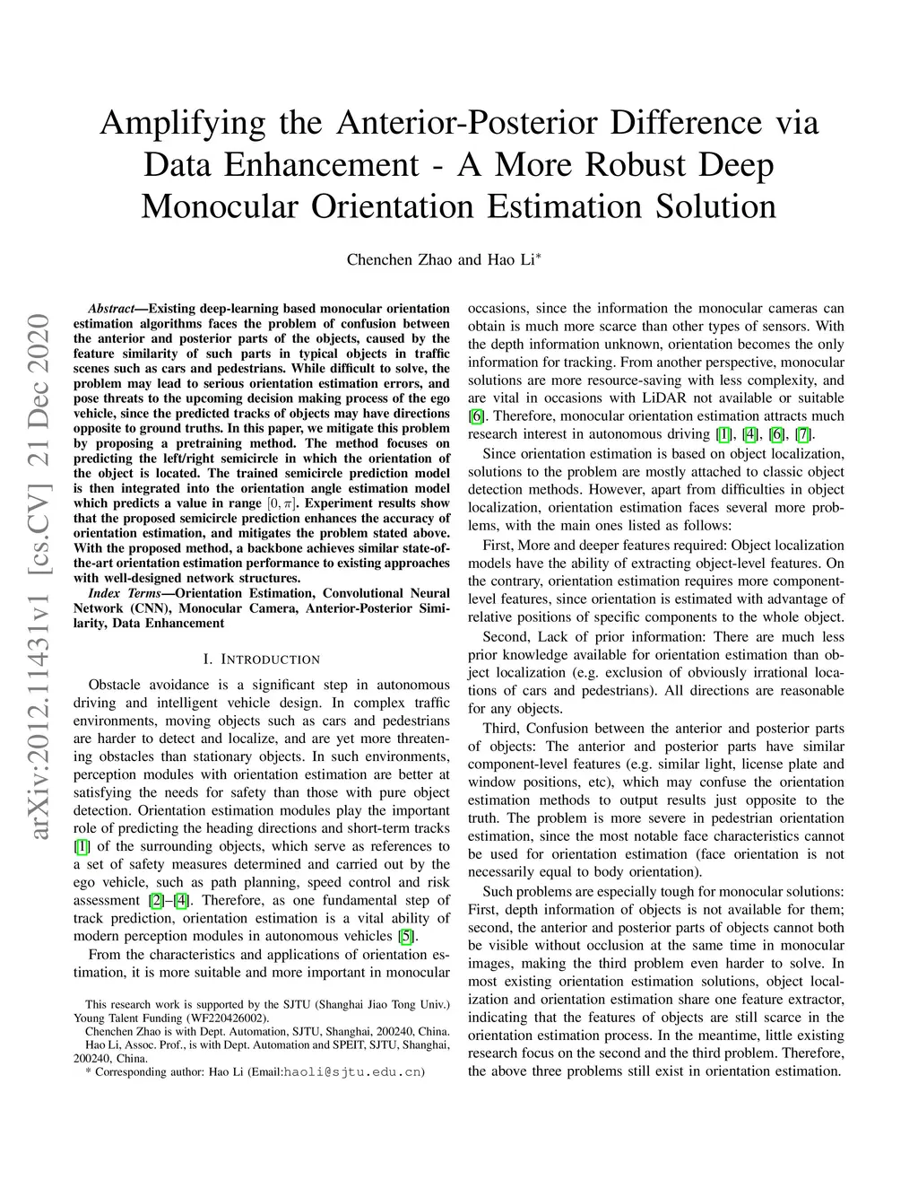 Existing deep-learning based monocular orientation estimation algorithms faces the problem of confusion between the anterior and posterior parts of the objects, caused by the feature similarity of such parts in typical objects in traffic scenes such as cars and pedestrians. While difficult to solve, the problem may lead to serious orientation estimation errors, and pose threats to the upcoming decision making process of the ego vehicle, since the predicted tracks of objects may have directions opposite to ground truths. In this paper, we mitigate this problem by proposing a pretraining method. The method focuses on predicting the left/right semicircle in which the orientation of the object is located. The trained semicircle prediction model is then integrated into the orientation angle estimation model which predicts a value in range . Experiment results show that the proposed semicircle prediction enhances the accuracy of orientation estimation, and mitigates the problem stated above. With the proposed method, a backbone achieves similar state-of-the-art orientation estimation performance to existing approaches with well-designed network structures.