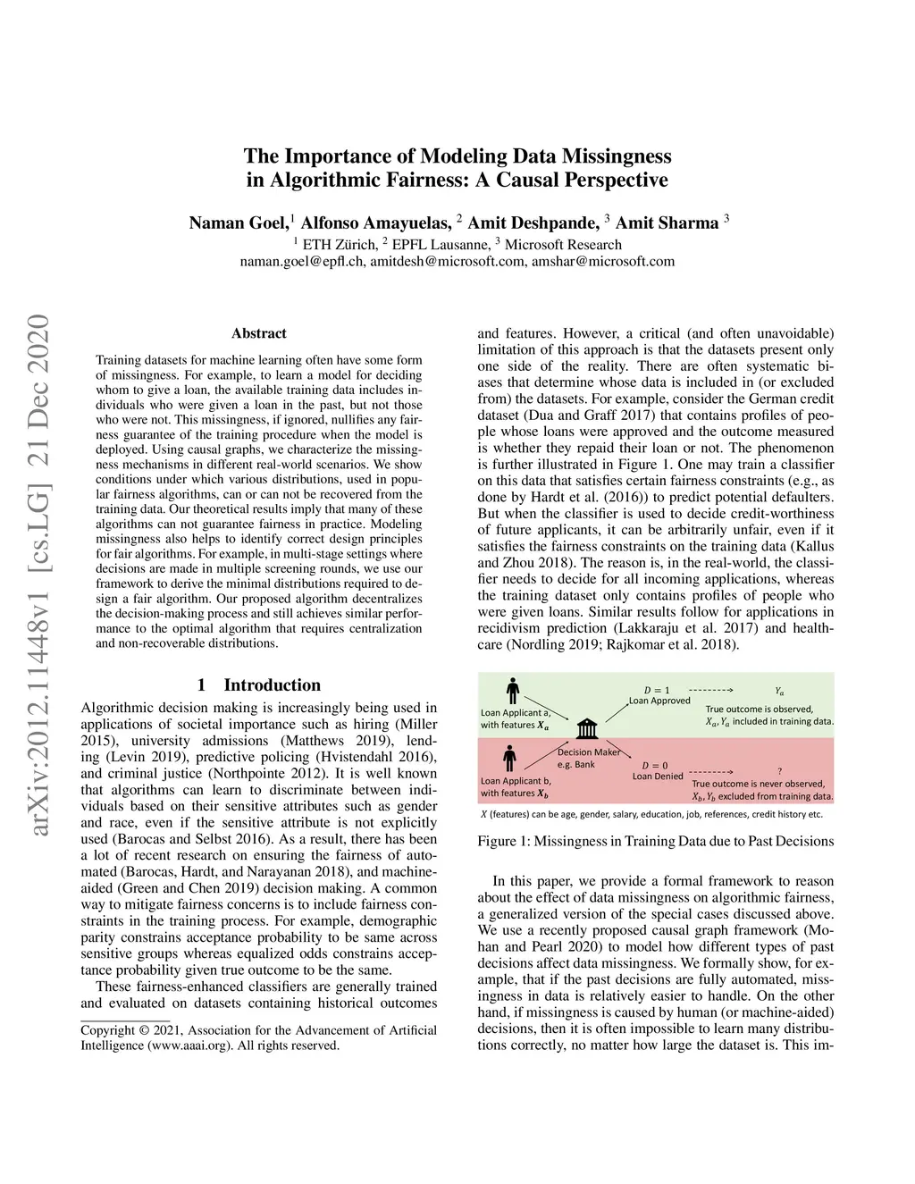 Training datasets for machine learning often have some form of missingness. For example, to learn a model for deciding whom to give a loan, the available training data includes individuals who were given a loan in the past, but not those who were not. This missingness, if ignored, nullifies any fairness guarantee of the training procedure when the model is deployed. Using causal graphs, we characterize the missingness mechanisms in different real-world scenarios. We show conditions under which various distributions, used in popular fairness algorithms, can or can not be recovered from the training data. Our theoretical results imply that many of these algorithms can not guarantee fairness in practice. Modeling missingness also helps to identify correct design principles for fair algorithms. For example, in multi-stage settings where decisions are made in multiple screening rounds, we use our framework to derive the minimal distributions required to design a fair algorithm. Our proposed algorithm decentralizes the decision-making process and still achieves similar performance to the optimal algorithm that requires centralization and non-recoverable distributions.