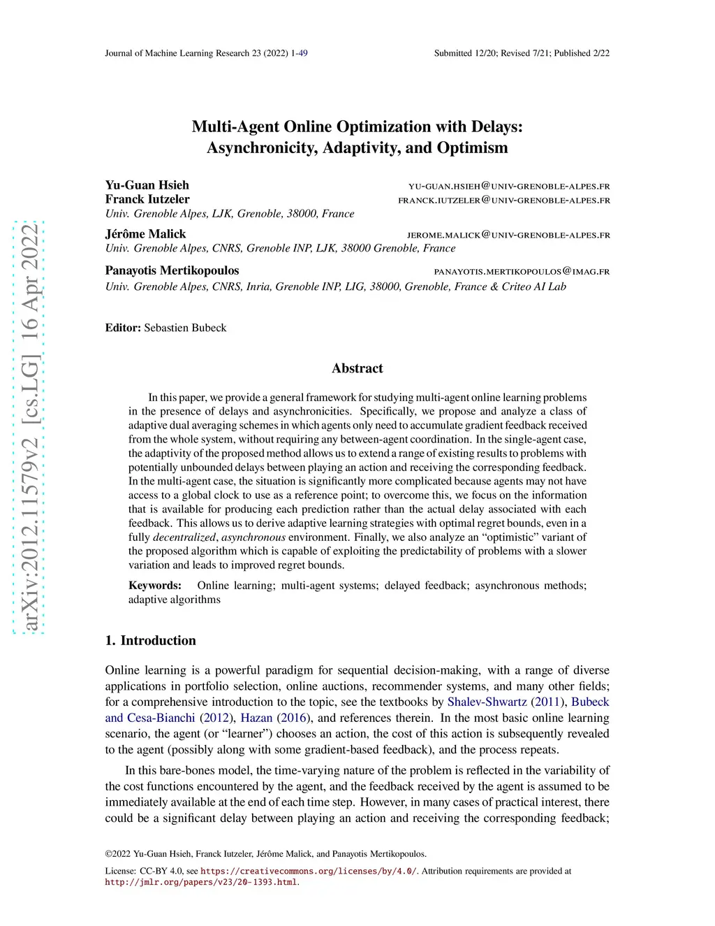 In this paper, we provide a general framework for studying multi-agent online learning problems in the presence of delays and asynchronicities. Specifically, we propose and analyze a class of adaptive dual averaging schemes in which agents only need to accumulate gradient feedback received from the whole system, without requiring any between-agent coordination. In the single-agent case, the adaptivity of the proposed method allows us to extend a range of existing results to problems with potentially unbounded delays between playing an action and receiving the corresponding feedback. In the multi-agent case, the situation is significantly more complicated because agents may not have access to a global clock to use as a reference point; to overcome this, we focus on the information that is available for producing each prediction rather than the actual delay associated with each feedback. This allows us to derive adaptive learning strategies with optimal regret bounds, even in a fully decentralized, asynchronous environment. Finally, we also analyze an "optimistic" variant of the proposed algorithm which is capable of exploiting the predictability of problems with a slower variation and leads to improved regret bounds.