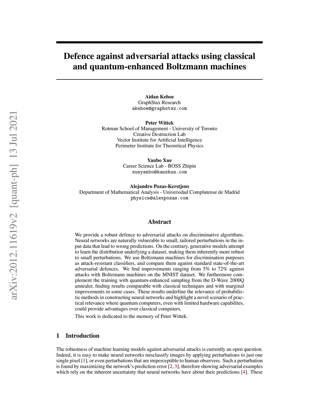 We provide a robust defence to adversarial attacks on discriminative algorithms. Neural networks are naturally vulnerable to small, tailored perturbations in the input data that lead to wrong predictions. On the contrary, generative models attempt to learn the distribution underlying a dataset, making them inherently more robust to small perturbations. We use Boltzmann machines for discrimination purposes as attack-resistant classifiers, and compare them against standard state-of-the-art adversarial defences. We find improvements ranging from 5% to 72% against attacks with Boltzmann machines on the MNIST dataset. We furthermore complement the training with quantum-enhanced sampling from the D-Wave 2000Q annealer, finding results comparable with classical techniques and with marginal improvements in some cases. These results underline the relevance of probabilistic methods in constructing neural networks and highlight a novel scenario of practical relevance where quantum computers, even with limited hardware capabilites, could provide advantages over classical computers. This work is dedicated to the memory of Peter Wittek.