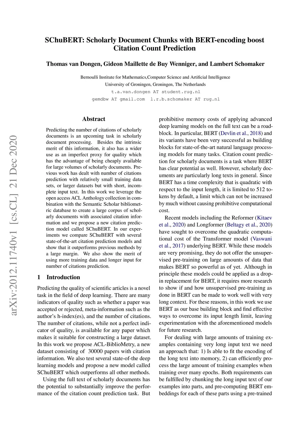 Predicting the number of citations of scholarly documents is an upcoming task in scholarly document processing. Besides the intrinsic merit of this information, it also has a wider use as an imperfect proxy for quality which has the advantage of being cheaply available for large volumes of scholarly documents. Previous work has dealt with number of citations prediction with relatively small training data sets, or larger datasets but with short, incomplete input text. In this work we leverage the open access ACL Anthology collection in combination with the Semantic Scholar bibliometric database to create a large corpus of scholarly documents with associated citation information and we propose a new citation prediction model called SChuBERT. In our experiments we compare SChuBERT with several state-of-the-art citation prediction models and show that it outperforms previous methods by a large margin. We also show the merit of using more training data and longer input for number of citations prediction.