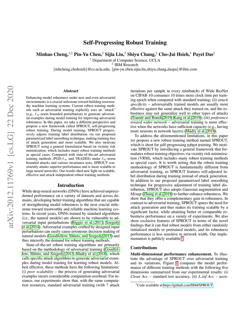 Enhancing model robustness under new and even adversarial environments is a crucial milestone toward building trustworthy machine learning systems. Current robust training methods such as adversarial training explicitly uses an "attack" (e.g., -norm bounded perturbation) to generate adversarial examples during model training for improving adversarial robustness. In this paper, we take a different perspective and propose a new framework called SPROUT, self-progressing robust training. During model training, SPROUT progressively adjusts training label distribution via our proposed parametrized label smoothing technique, making training free of attack generation and more scalable. We also motivate SPROUT using a general formulation based on vicinity risk minimization, which includes many robust training methods as special cases. Compared with state-of-the-art adversarial training methods (PGD-l_inf and TRADES) under l_inf-norm bounded attacks and various invariance tests, SPROUT consistently attains superior performance and is more scalable to large neural networks. Our results shed new light on scalable, effective and attack-independent robust training methods.
