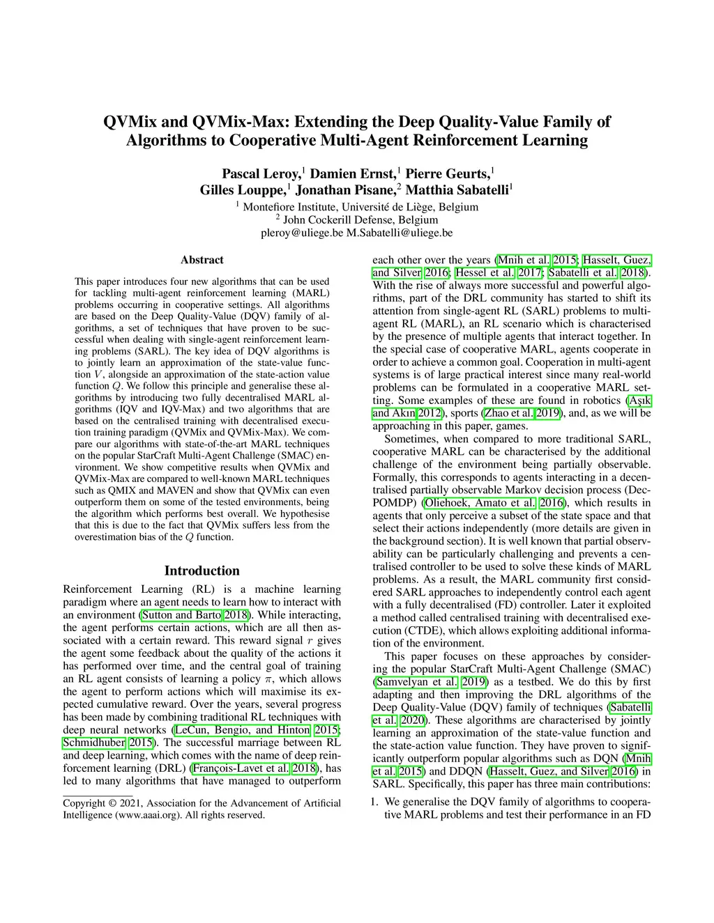 This paper introduces four new algorithms that can be used for tackling multi-agent reinforcement learning (MARL) problems occurring in cooperative settings. All algorithms are based on the Deep Quality-Value (DQV) family of algorithms, a set of techniques that have proven to be successful when dealing with single-agent reinforcement learning problems (SARL). The key idea of DQV algorithms is to jointly learn an approximation of the state-value function , alongside an approximation of the state-action value function . We follow this principle and generalise these algorithms by introducing two fully decentralised MARL algorithms (IQV and IQV-Max) and two algorithms that are based on the centralised training with decentralised execution training paradigm (QVMix and QVMix-Max). We compare our algorithms with state-of-the-art MARL techniques on the popular StarCraft Multi-Agent Challenge (SMAC) environment. We show competitive results when QVMix and QVMix-Max are compared to well-known MARL techniques such as QMIX and MAVEN and show that QVMix can even outperform them on some of the tested environments, being the algorithm which performs best overall. We hypothesise that this is due to the fact that QVMix suffers less from the overestimation bias of the function.