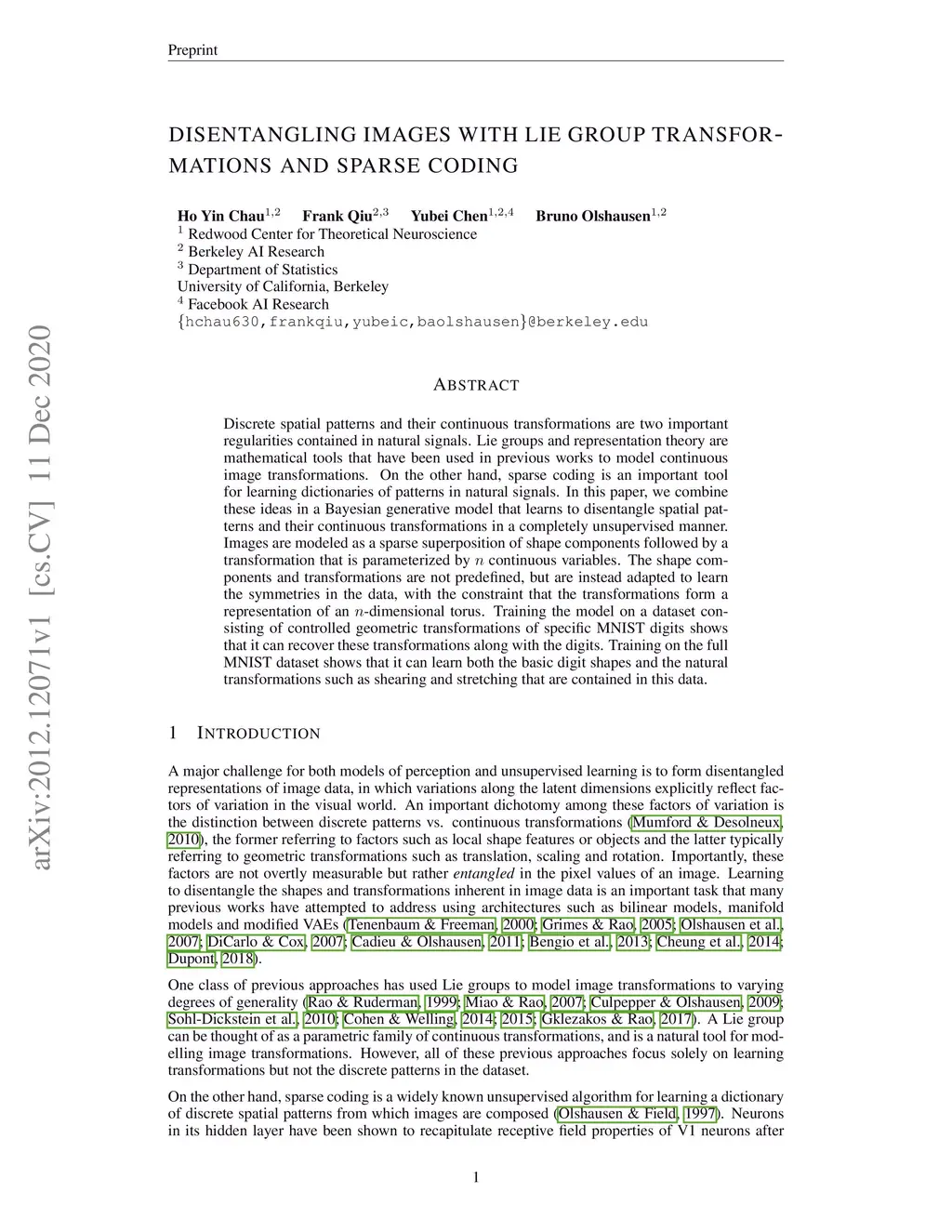 Discrete spatial patterns and their continuous transformations are two important regularities contained in natural signals. Lie groups and representation theory are mathematical tools that have been used in previous works to model continuous image transformations. On the other hand, sparse coding is an important tool for learning dictionaries of patterns in natural signals. In this paper, we combine these ideas in a Bayesian generative model that learns to disentangle spatial patterns and their continuous transformations in a completely unsupervised manner. Images are modeled as a sparse superposition of shape components followed by a transformation that is parameterized by n continuous variables. The shape components and transformations are not predefined, but are instead adapted to learn the symmetries in the data, with the constraint that the transformations form a representation of an n-dimensional torus. Training the model on a dataset consisting of controlled geometric transformations of specific MNIST digits shows that it can recover these transformations along with the digits. Training on the full MNIST dataset shows that it can learn both the basic digit shapes and the natural transformations such as shearing and stretching that are contained in this data.