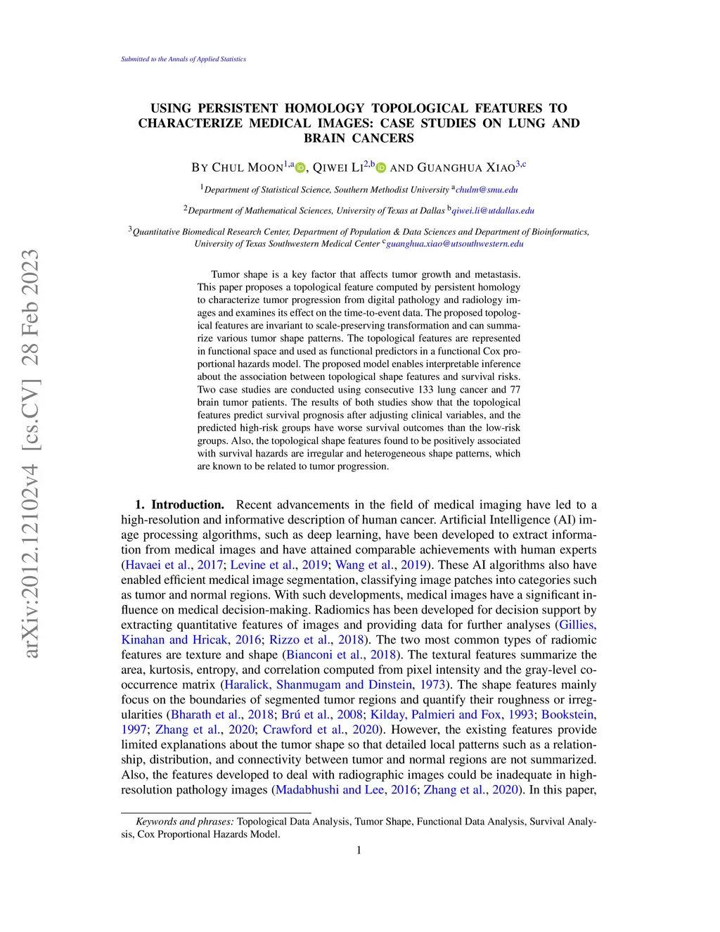 Tumor shape is a key factor that affects tumor growth and metastasis. This paper proposes a topological feature computed by persistent homology to characterize tumor progression from digital pathology and radiology images and examines its effect on the time-to-event data. The proposed topological features are invariant to scale-preserving transformation and can summarize various tumor shape patterns. The topological features are represented in functional space and used as functional predictors in a functional Cox proportional hazards model. The proposed model enables interpretable inference about the association between topological shape features and survival risks. Two case studies are conducted using consecutive 133 lung cancer and 77 brain tumor patients. The results of both studies show that the topological features predict survival prognosis after adjusting clinical variables, and the predicted high-risk groups have worse survival outcomes than the low-risk groups. Also, the topological shape features found to be positively associated with survival hazards are irregular and heterogeneous shape patterns, which are known to be related to tumor progression.