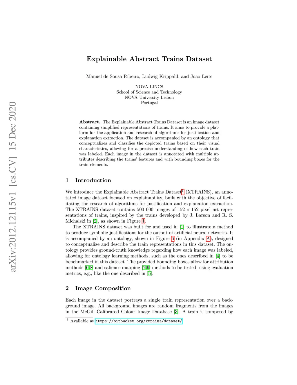 The Explainable Abstract Trains Dataset is an image dataset containing simplified representations of trains. It aims to provide a platform for the application and research of algorithms for justification and explanation extraction. The dataset is accompanied by an ontology that conceptualizes and classifies the depicted trains based on their visual characteristics, allowing for a precise understanding of how each train was labeled. Each image in the dataset is annotated with multiple attributes describing the trains' features and with bounding boxes for the train elements.