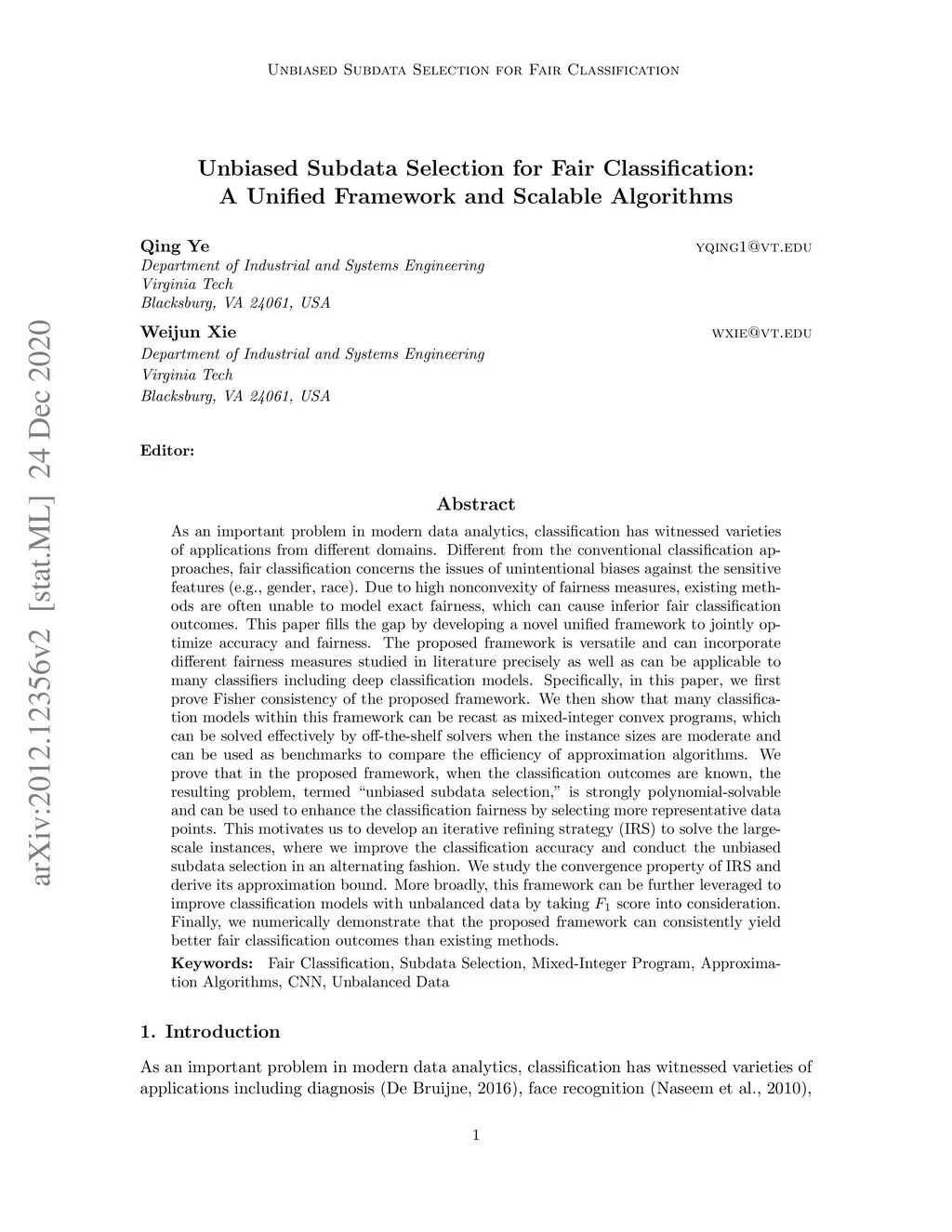 As an important problem in modern data analytics, classification has witnessed varieties of applications from different domains. Different from conventional classification approaches, fair classification concerns the issues of unintentional biases against the sensitive features (e.g., gender, race). Due to high nonconvexity of fairness measures, existing methods are often unable to model exact fairness, which can cause inferior fair classification outcomes. This paper fills the gap by developing a novel unified framework to jointly optimize accuracy and fairness. The proposed framework is versatile and can incorporate different fairness measures studied in literature precisely as well as can be applicable to many classifiers including deep classification models. Specifically, in this paper, we first prove Fisher consistency of the proposed framework. We then show that many classification models within this framework can be recast as mixed-integer convex programs, which can be solved effectively by off-the-shelf solvers when the instance sizes are moderate and can be used as benchmarks to compare the efficiency of approximation algorithms. We prove that in the proposed framework, when the classification outcomes are known, the resulting problem, termed "unbiased subdata selection," is strongly polynomial-solvable and can be used to enhance the classification fairness by selecting more representative data points. This motivates us to develop an iterative refining strategy (IRS) to solve the large-scale instances, where we improve the classification accuracy and conduct the unbiased subdata selection in an alternating fashion. We study the convergence property of IRS and derive its approximation bound. More broadly, this framework can be leveraged to improve classification models with unbalanced data by taking F1 score into consideration.