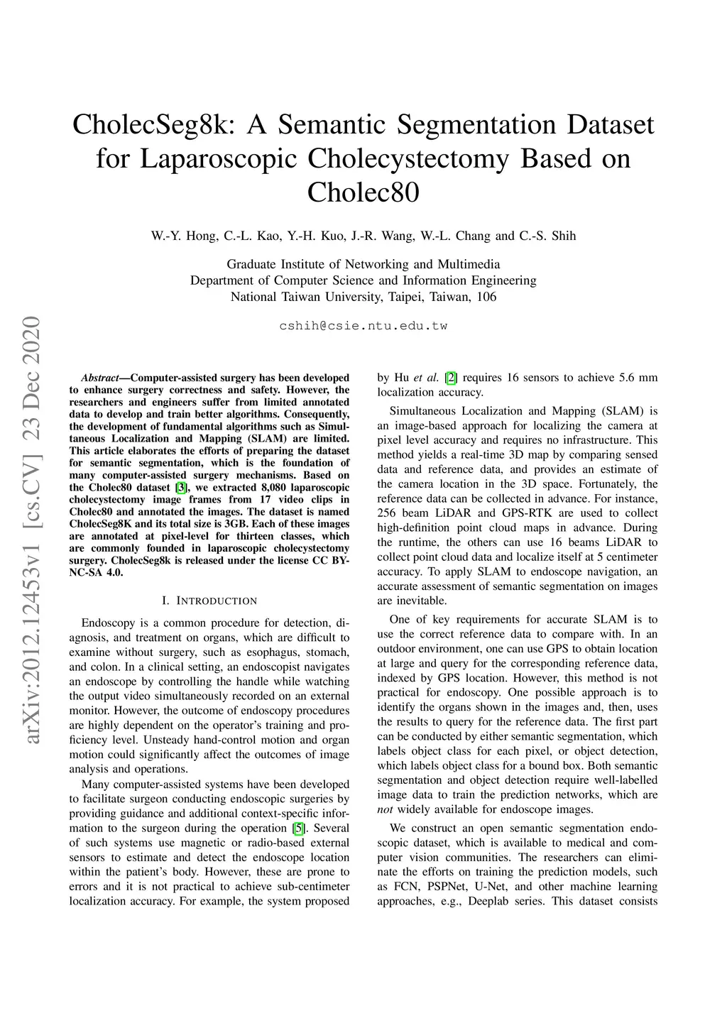 Computer-assisted surgery has been developed to enhance surgery correctness and safety. However, researchers and engineers suffer from limited annotated data to develop and train better algorithms. Consequently, the development of fundamental algorithms such as Simultaneous Localization and Mapping (SLAM) is limited. This article elaborates on the efforts of preparing the dataset for semantic segmentation, which is the foundation of many computer-assisted surgery mechanisms. Based on the Cholec80 dataset [3], we extracted 8,080 laparoscopic cholecystectomy image frames from 17 video clips in Cholec80 and annotated the images. The dataset is named CholecSeg8K and its total size is 3GB. Each of these images is annotated at pixel-level for thirteen classes, which are commonly founded in laparoscopic cholecystectomy surgery. CholecSeg8k is released under the license CC BY- NC-SA 4.0.