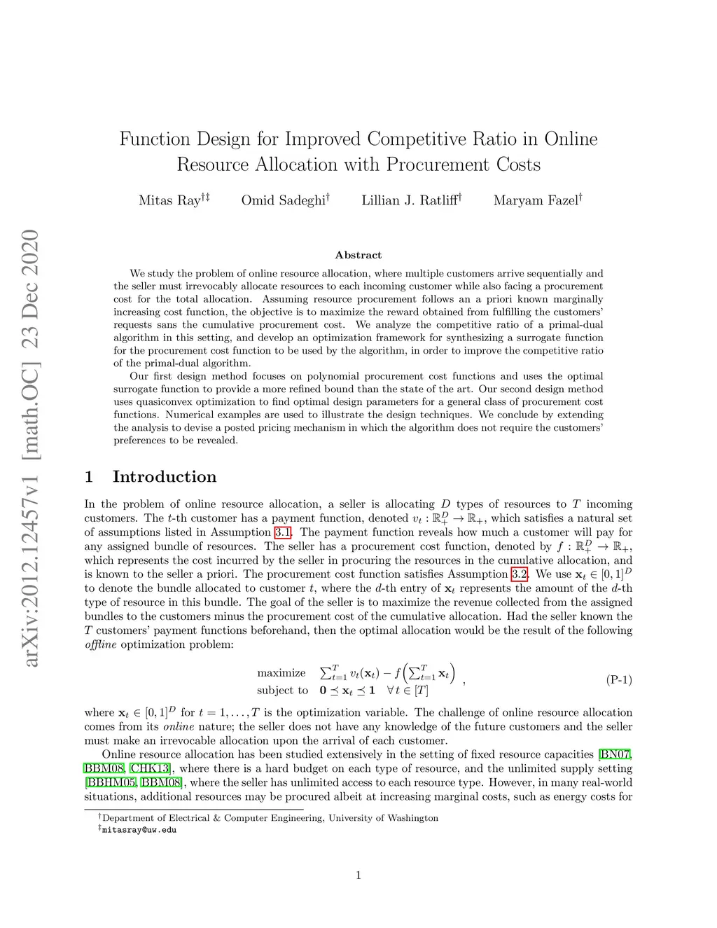 We study the problem of online resource allocation, where multiple customers arrive sequentially and the seller must irrevocably allocate resources to each incoming customer while also facing a procurement cost for the total allocation. Assuming resource procurement follows an a priori known marginally increasing cost function, the objective is to maximize the reward obtained from fulfilling the customers' requests sans the cumulative procurement cost. We analyze the competitive ratio of a primal-dual algorithm in this setting, and develop an optimization framework for synthesizing a surrogate function for the procurement cost function to be used by the algorithm, in order to improve the competitive ratio of the primal-dual algorithm. Our first design method focuses on polynomial procurement cost functions and uses the optimal surrogate function to provide a more refined bound than the state of the art. Our second design method uses quasiconvex optimization to find optimal design parameters for a general class of procurement cost functions. Numerical examples are used to illustrate the design techniques. We conclude by extending the analysis to devise a posted pricing mechanism in which the algorithm does not require the customers' preferences to be revealed.