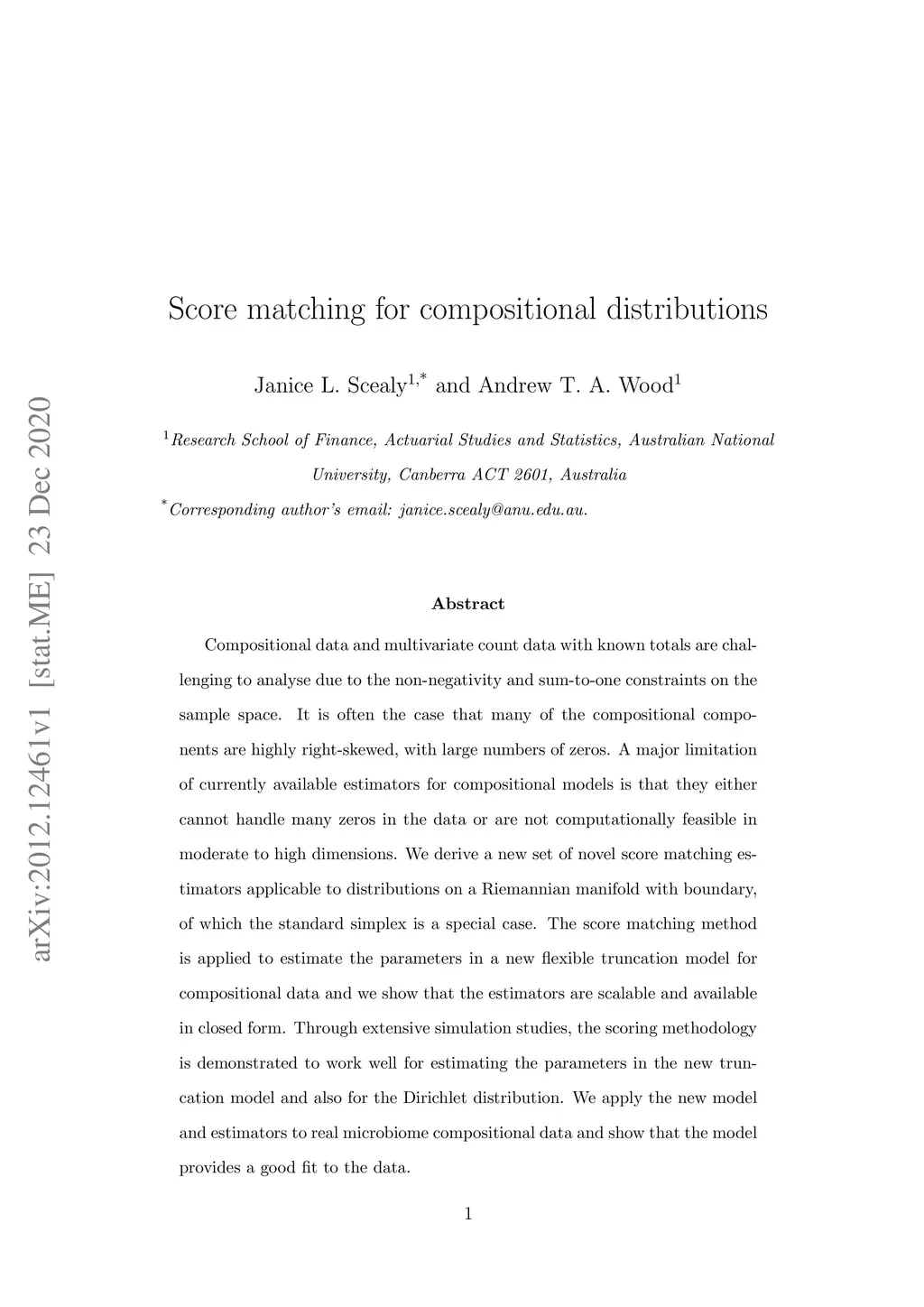Compositional data and multivariate count data with known totals are challenging to analyse due to the non-negativity and sum-to-one constraints on the sample space. It is often the case that many of the compositional components are highly right-skewed, with large numbers of zeros. A major limitation of currently available estimators for compositional models is that they either cannot handle many zeros in the data or are not computationally feasible in moderate to high dimensions. We derive a new set of novel score matching estimators applicable to distributions on a Riemannian manifold with boundary, of which the standard simplex is a special case. The score matching method is applied to estimate the parameters in a new flexible truncation model for compositional data and we show that the estimators are scalable and available in closed form. Through extensive simulation studies, the scoring methodology is demonstrated to work well for estimating the parameters in the new truncation model and also for the Dirichlet distribution. We apply the new model and estimators to real microbiome compositional data and show that the model provides a good fit to the data.