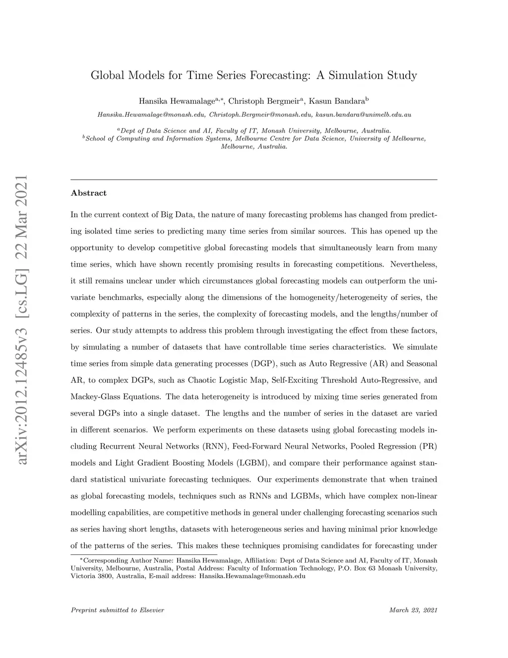 In the current context of Big Data, the nature of many forecasting problems has changed from predicting isolated time series to predicting many time series from similar sources. This has opened up the opportunity to develop competitive global forecasting models that simultaneously learn from many time series. But, it still remains unclear when global forecasting models can outperform the univariate benchmarks, especially along the dimensions of the homogeneity/heterogeneity of series, the complexity of patterns in the series, the complexity of forecasting models, and the lengths/number of series. Our study attempts to address this problem through investigating the effect from these factors, by simulating a number of datasets that have controllable time series characteristics. Specifically, we simulate time series from simple data generating processes (DGP), such as Auto Regressive (AR) and Seasonal AR, to complex DGPs, such as Chaotic Logistic Map, Self-Exciting Threshold Auto-Regressive, and Mackey-Glass Equations. The data heterogeneity is introduced by mixing time series generated from several DGPs into a single dataset. The lengths and the number of series in the dataset are varied in different scenarios. We perform experiments on these datasets using global forecasting models including Recurrent Neural Networks (RNN), Feed-Forward Neural Networks, Pooled Regression (PR) models and Light Gradient Boosting Models (LGBM), and compare their performance against standard statistical univariate forecasting techniques. Our experiments demonstrate that when trained as global forecasting models, techniques such as RNNs and LGBMs, which have complex non-linear modelling capabilities, are competitive methods in general under challenging forecasting scenarios such as series having short lengths, datasets with heterogeneous series and having minimal prior knowledge of the patterns of the series.