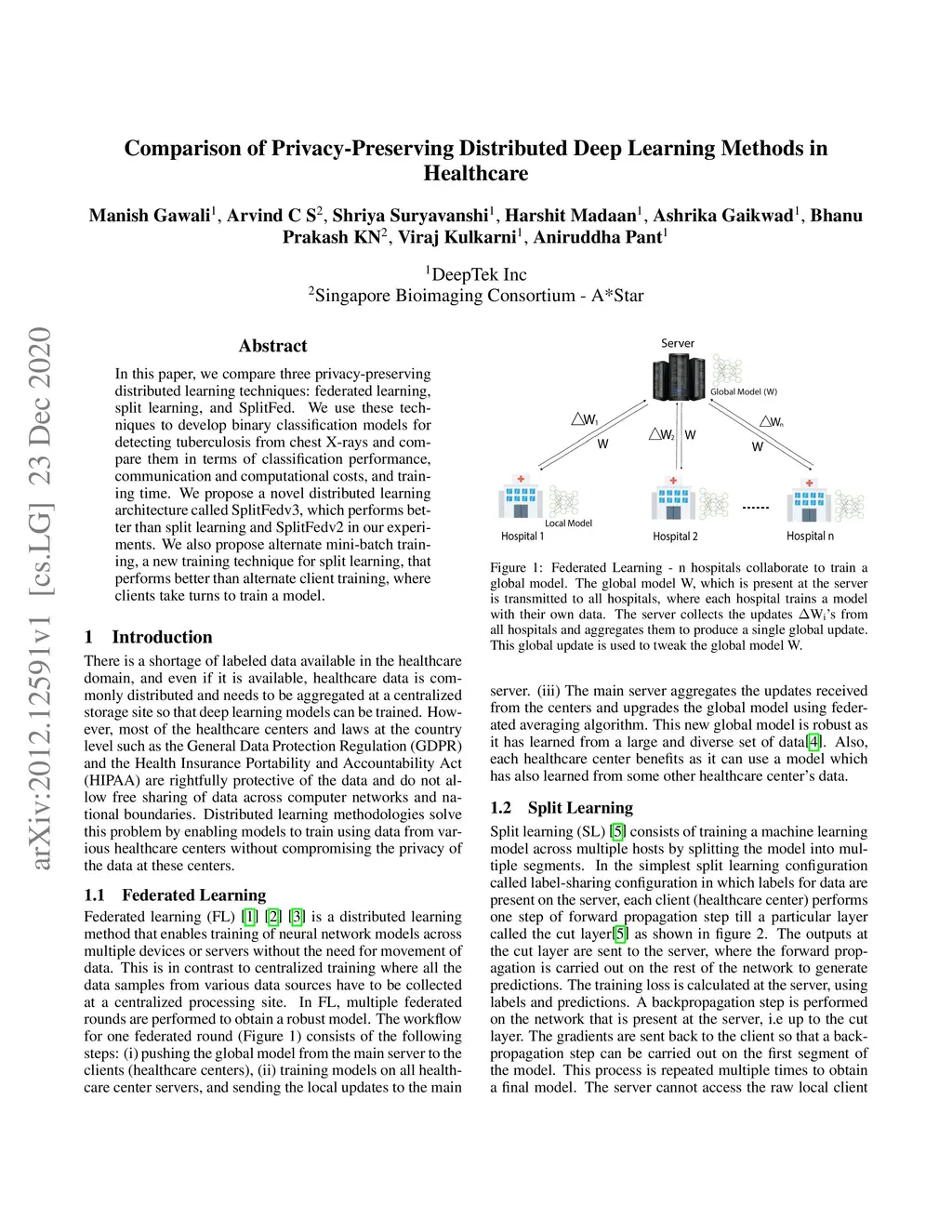 In this paper, we compare three privacy-preserving distributed learning techniques: federated learning, split learning, and SplitFed. We use these techniques to develop binary classification models for detecting tuberculosis from chest X-rays and compare them in terms of classification performance, communication and computational costs, and training time. We propose a novel distributed learning architecture called SplitFedv3, which performs better than split learning and SplitFedv2 in our experiments. We also propose alternate mini-batch training, a new training technique for split learning, that performs better than alternate client training, where clients take turns to train a model.
