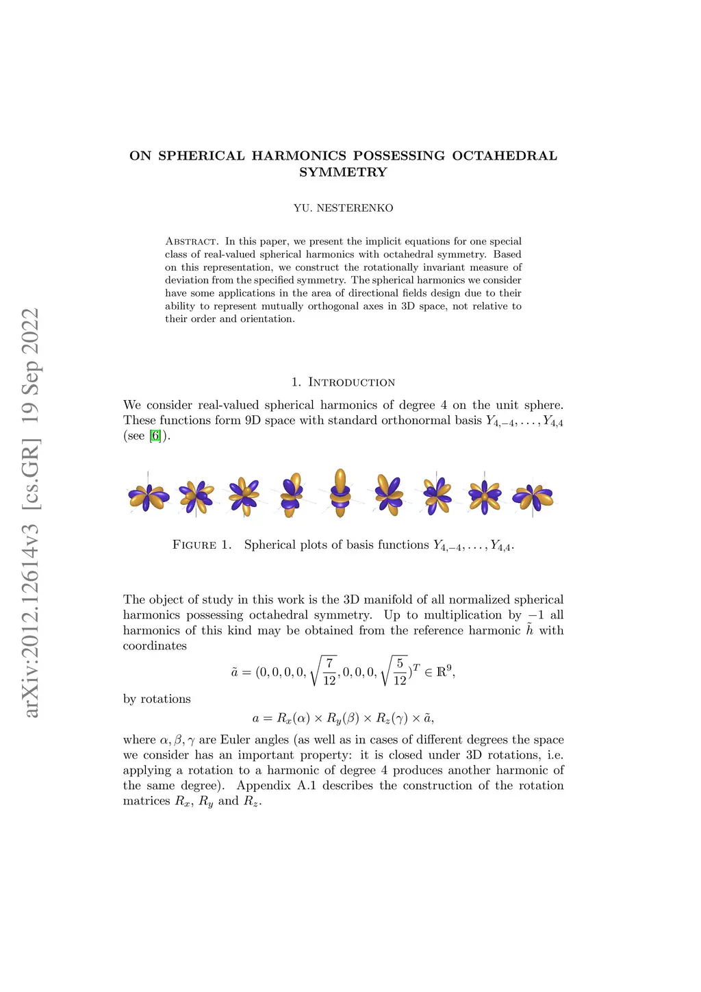 In this paper, we present the implicit representation of one special class of real-valued spherical harmonics with octahedral symmetry. Based on this representation we construct the rotationally invariant measure of deviation from the specified symmetry. The spherical harmonics we consider have some applications in the area of directional fields design due to their ability to represent mutually orthogonal axes in 3D space not relatively to their order and orientation.